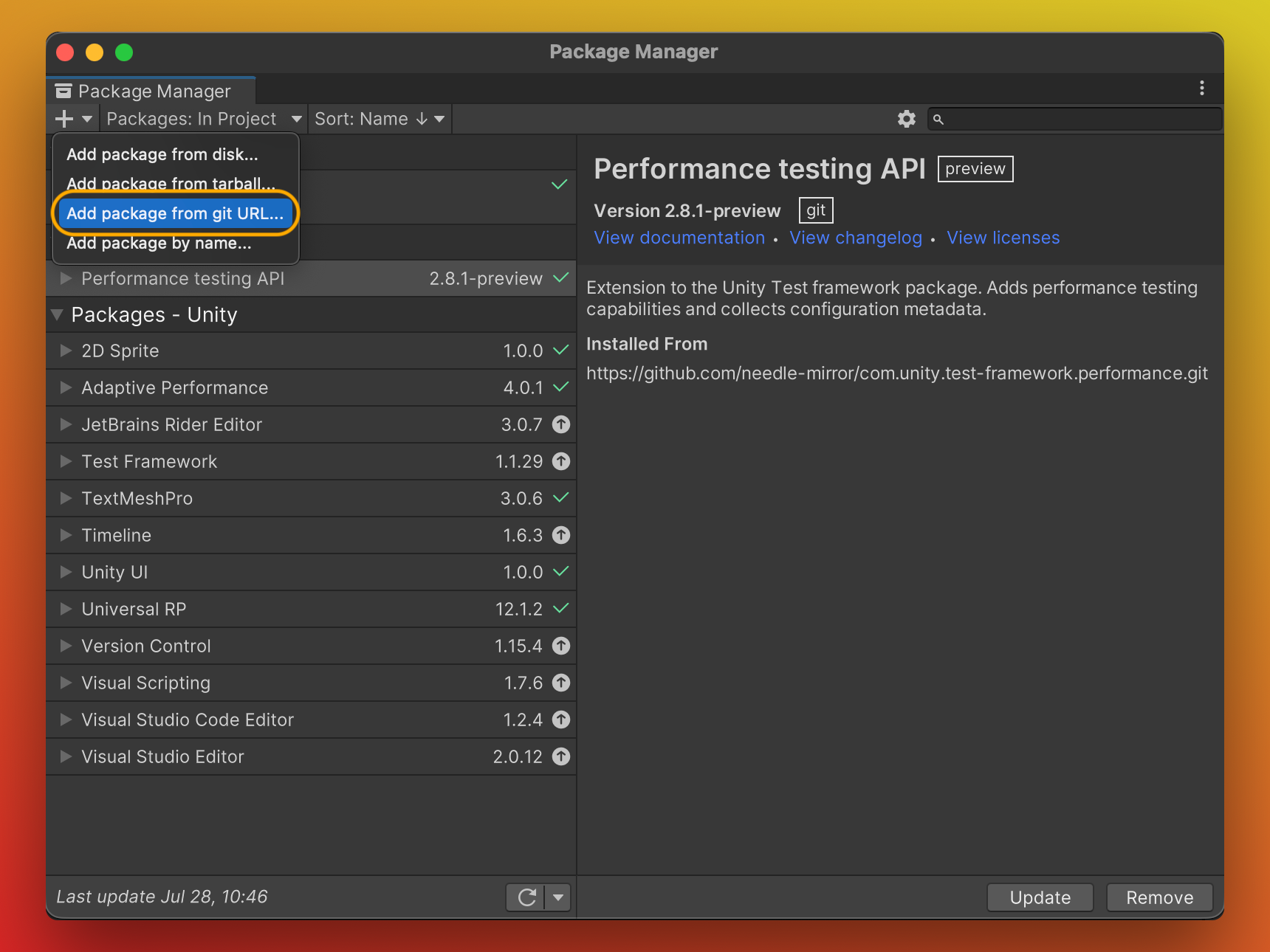 However, I prefer to use Unity Package Manager to fetch the com.unity.test-framework.performance as shown below.