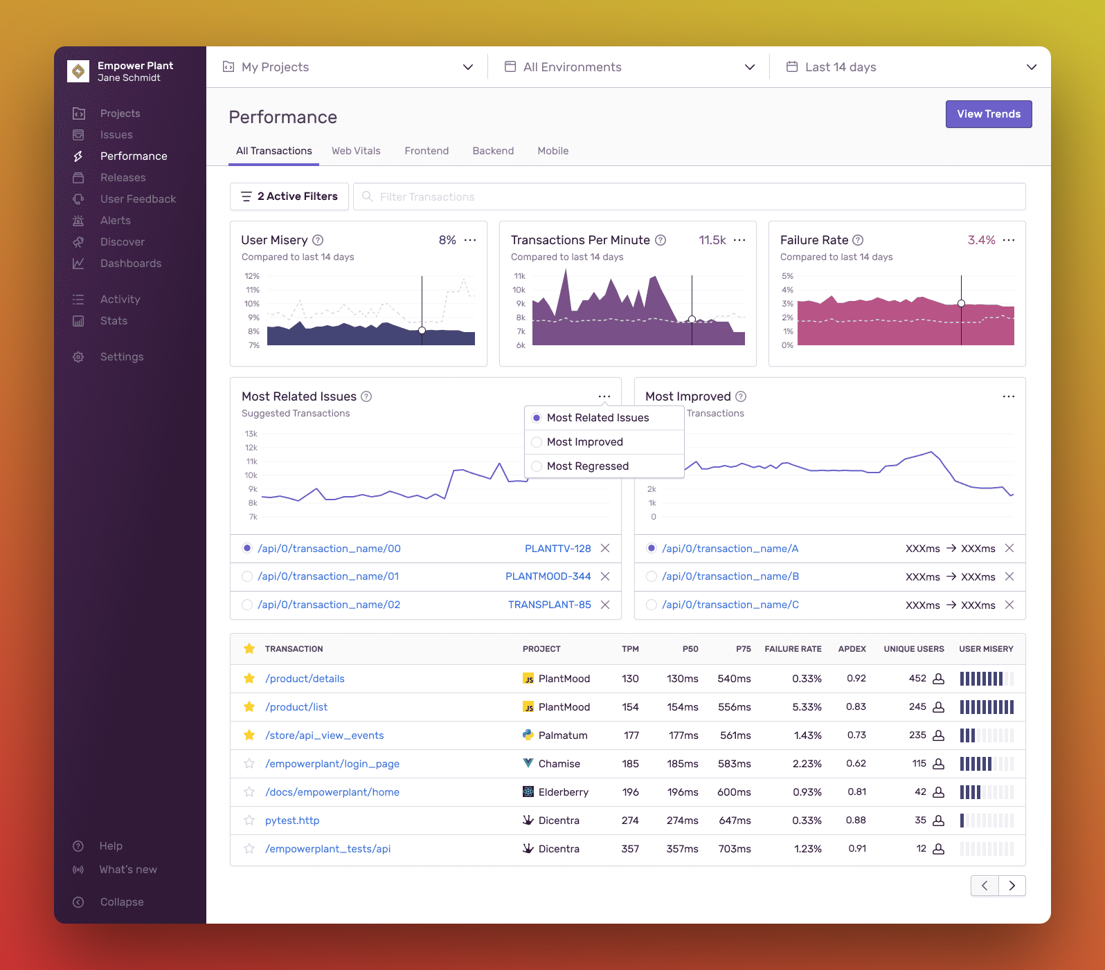 Sentry comes in handy for performance test automation due to its ease of use and alert functionality. You can set up real-time notifications to trigger customizable thresholds and integrations. For example, latency, the total number of errors, failure rate, and throughput are some performance metrics you can configure on Sentry.