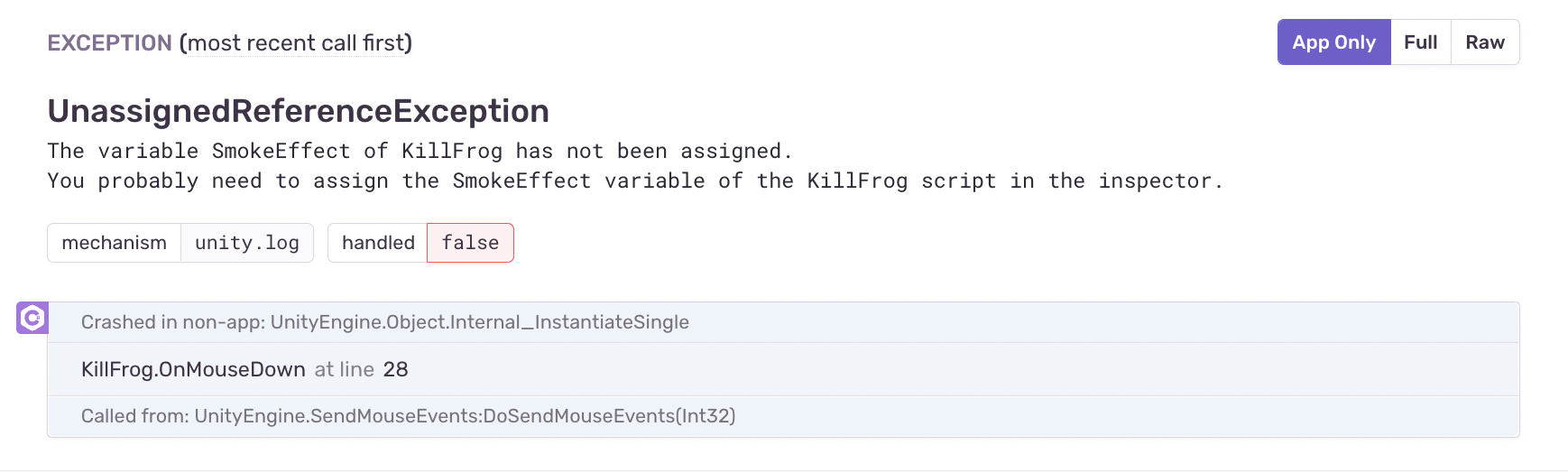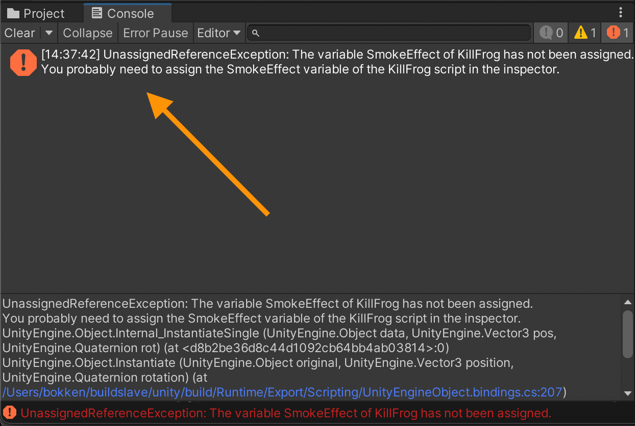As you can see, the frog is destroyed but there is no explosion effect and we get an error in the console, an Unassigned Reference Exception.