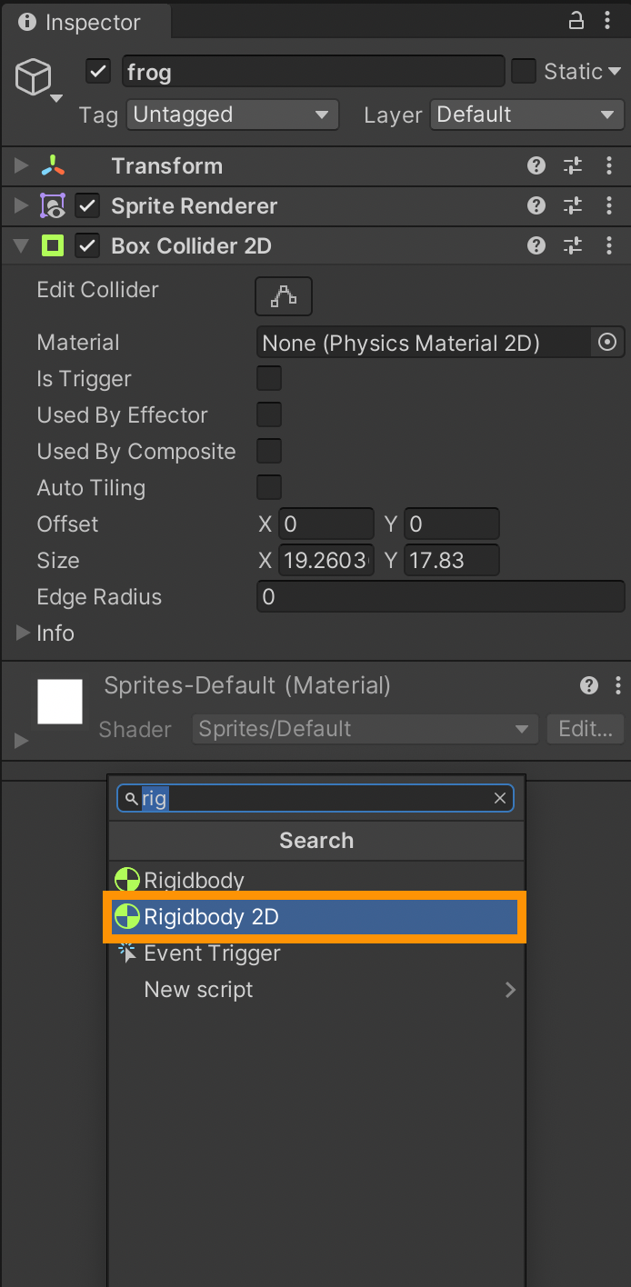 Now let’s add a Rigidbody 2D component to the frog by first clicking “Add Component”. We’ll then search for Rigidbody 2D and add it.