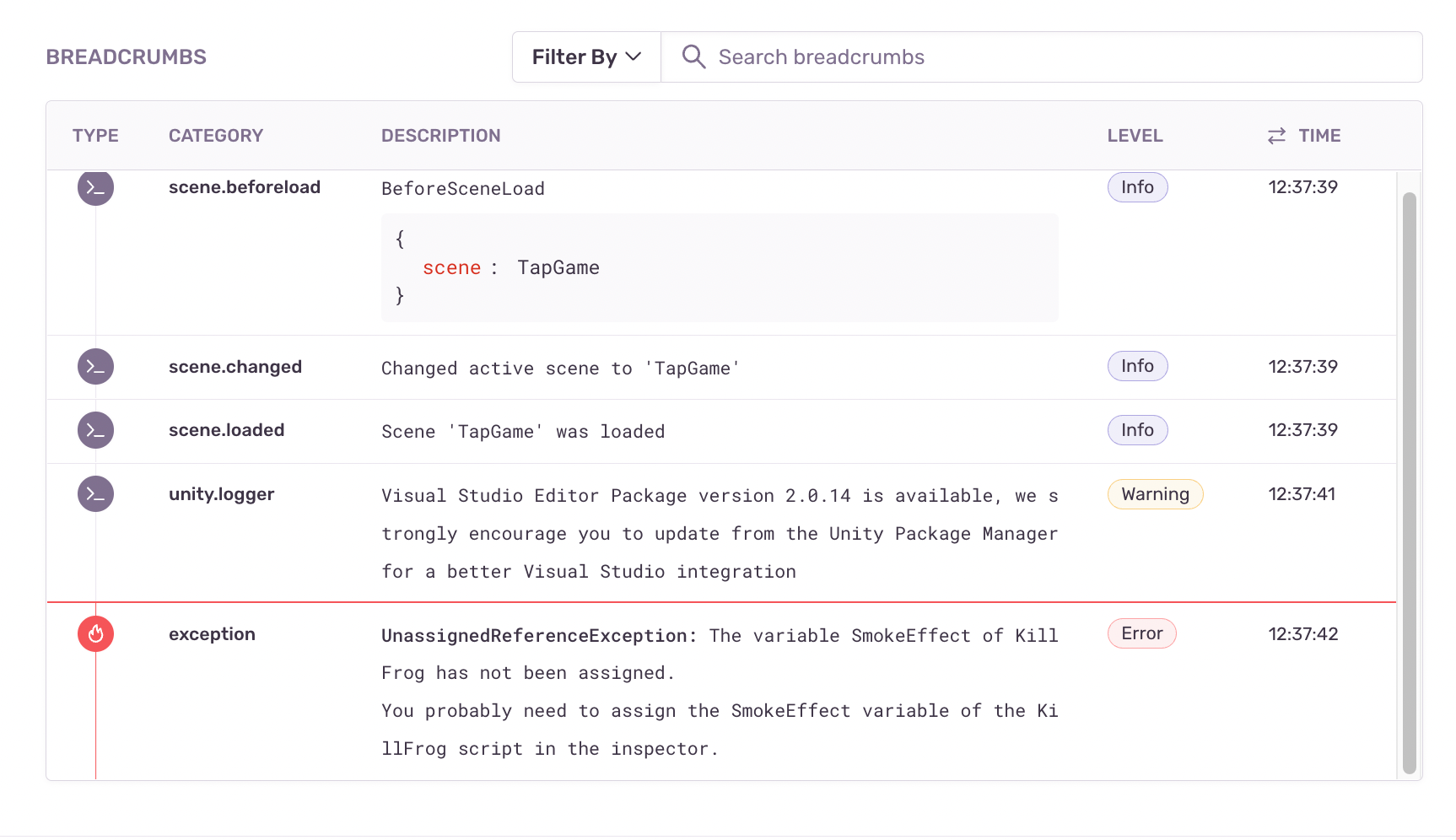 Below that we see the breadcrumbs, which shows us what happened leading up to the error occurring.