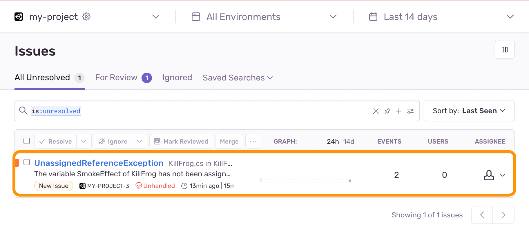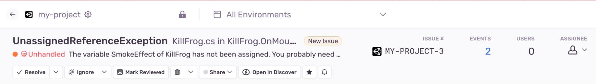 We can fix the issue by assigning the explosion prefab in the inspector and resolving it (clearing it out) in Sentry. Again, as mentioned above, if we want to set up a specific alert for if/when this error occurs again, we can manage our alerts to get notified when certain error criteria that set is met.