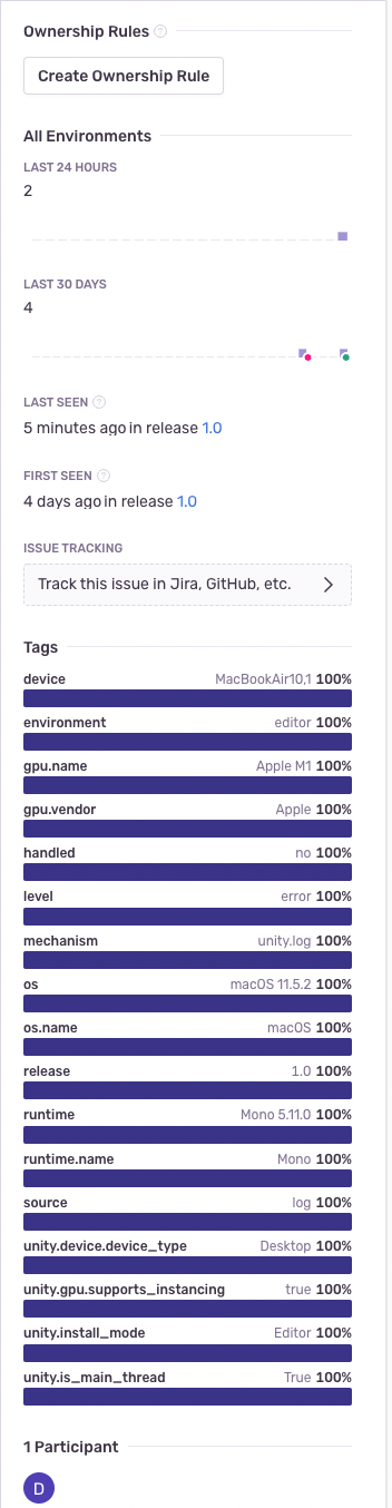 At the top, we see “Ownership Rules”, which are used when you have a team so that issues can be automatically routed to the right person to resolve the issue. Next, you will notice “first seen” and “last seen” times to give you a quick understanding of how long ago, and how recently, this issue has occurred. If you want to connect Sentry to your issue tracking tool, like Jira, you can do so here (as well as in Settings). Below that are tags related to this issue which provide even more context (what devices or operating systems are experiencing this particular error? Which release(s) is the error showing up in?). And finally, which team members are already participating/working on this issue.
