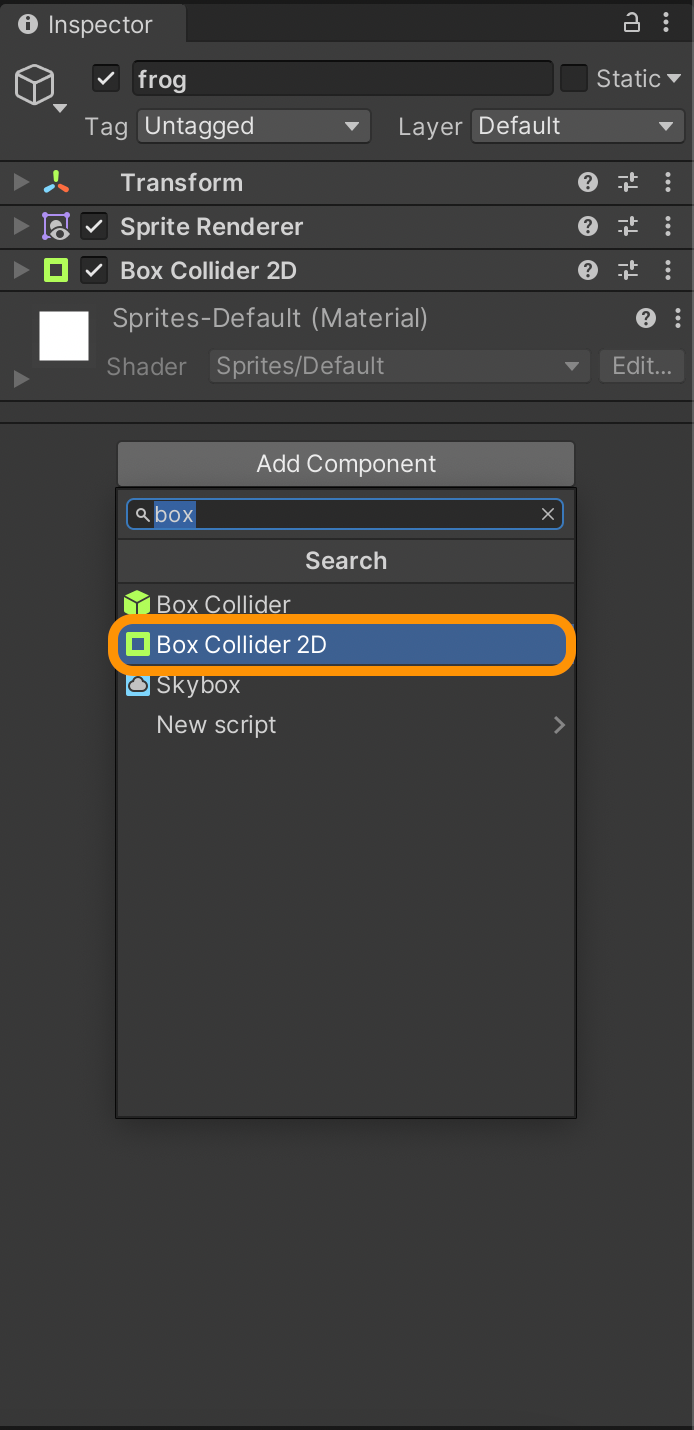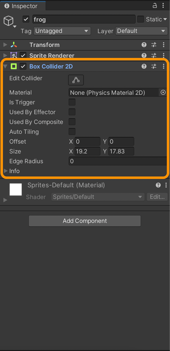 The frog’s shape is closer to a rectangle so I chose the Box Collider 2D.