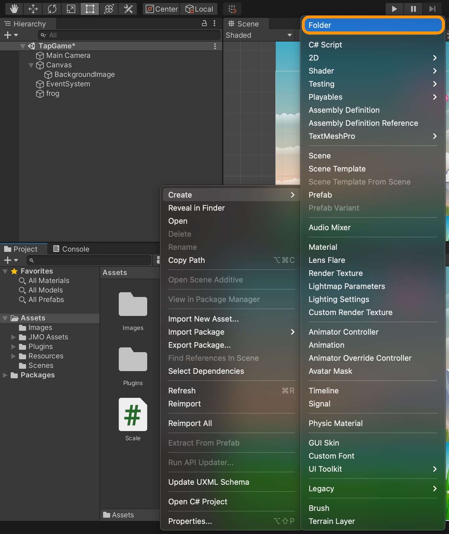 For organizational purposes, let’s create a new folder and name it “Scripts”. Move the “Scale” script we created in my last article to this folder. Right click in the Assets folder > Create > Folder, as shown in the image below.
