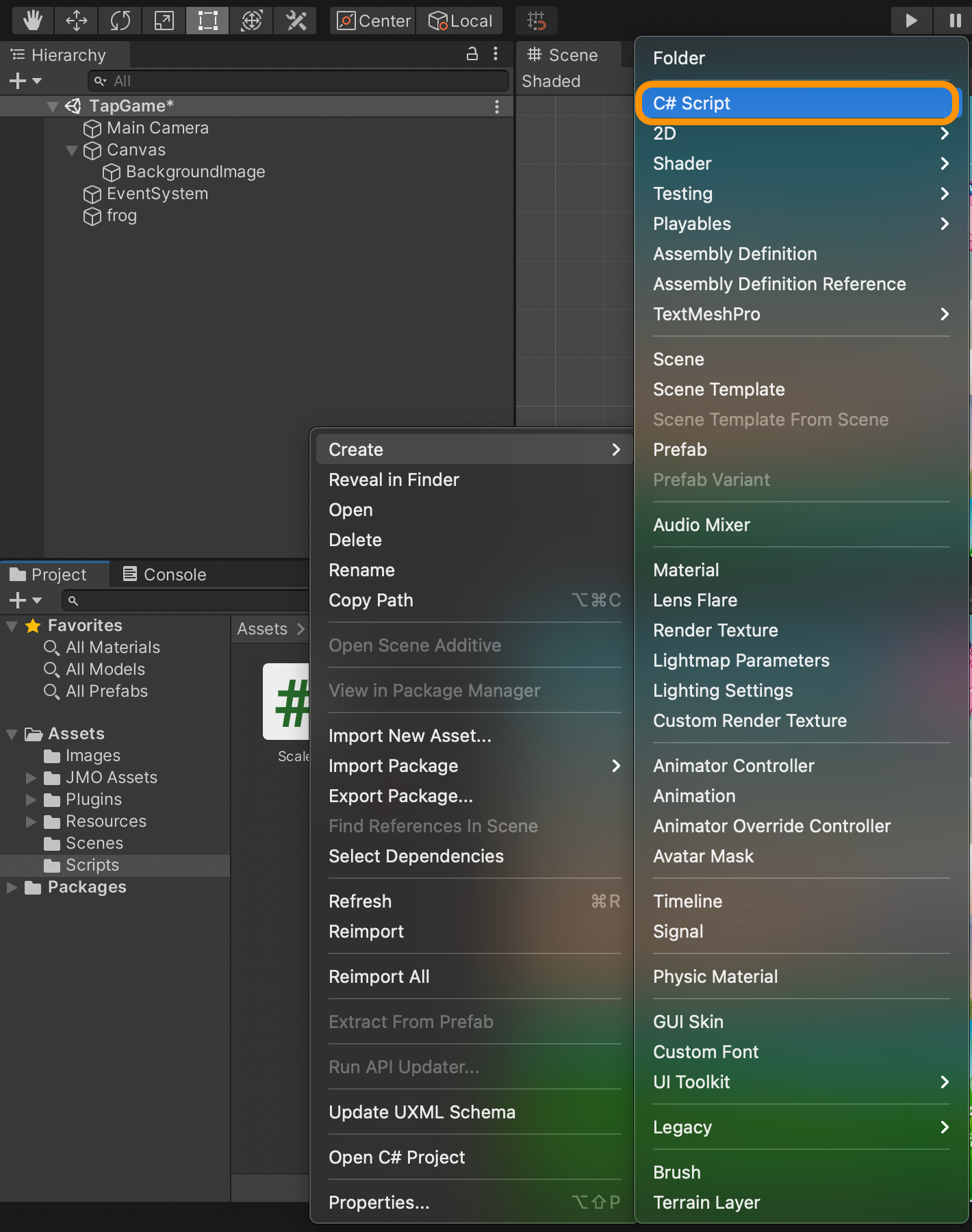 Now let’s create a new C# script inside the “Scripts” folder. Right click in the Scripts folder > Create > C# script, as shown in the image below.