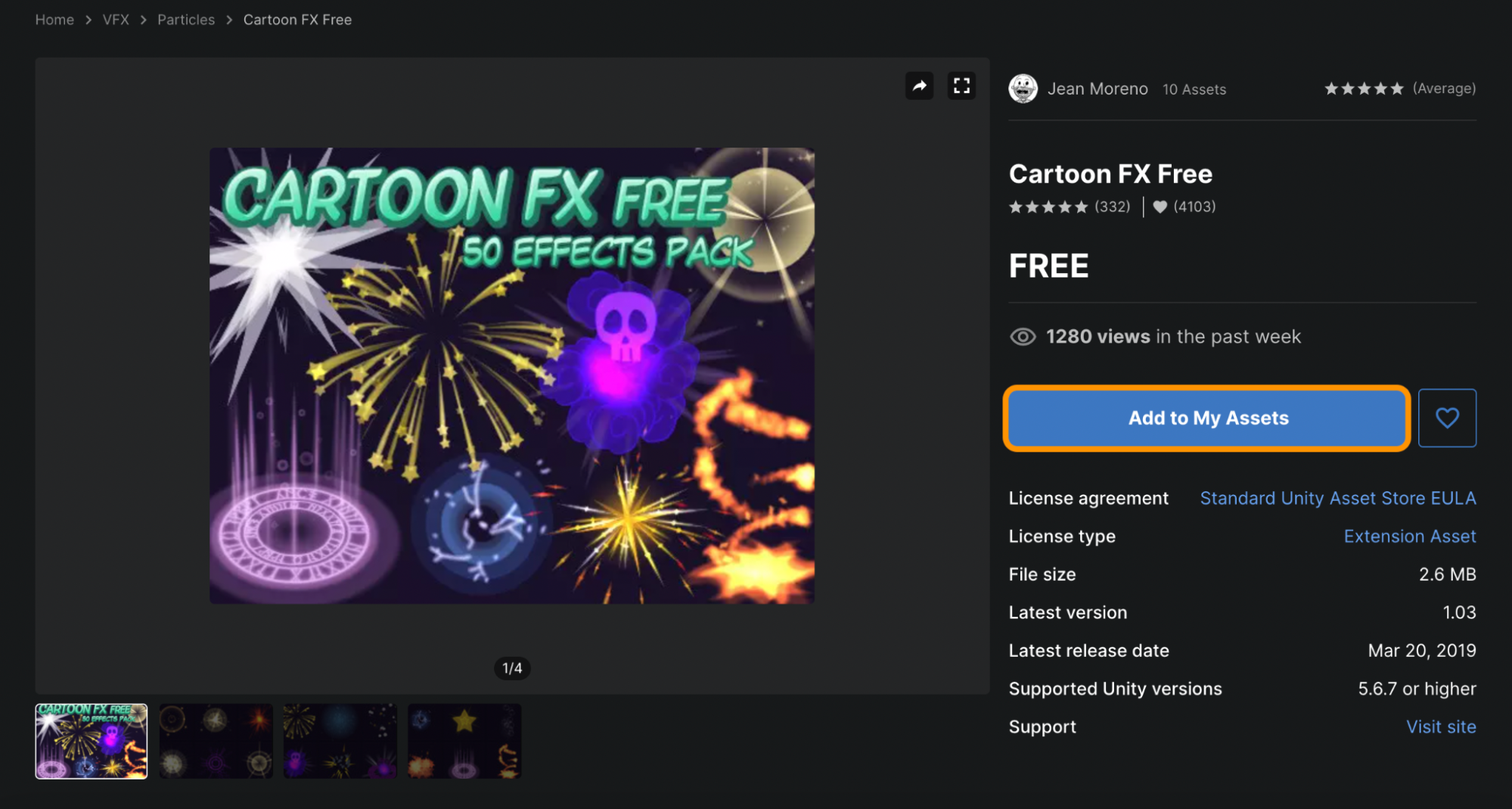 I will use the Cartoon FX Free effect. This asset is available for free and has around 50 cartoon effects.