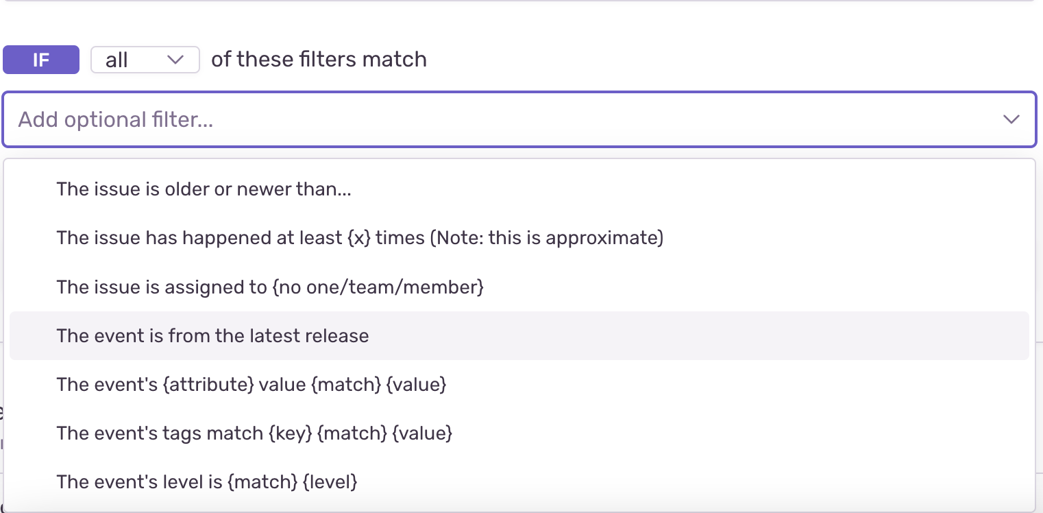 I want to get an email when there is an event and it is seen more than 5 times in 1 hour. Select from the filter options. Filter is for adding “if” conditions to rule out unneeded errors.
