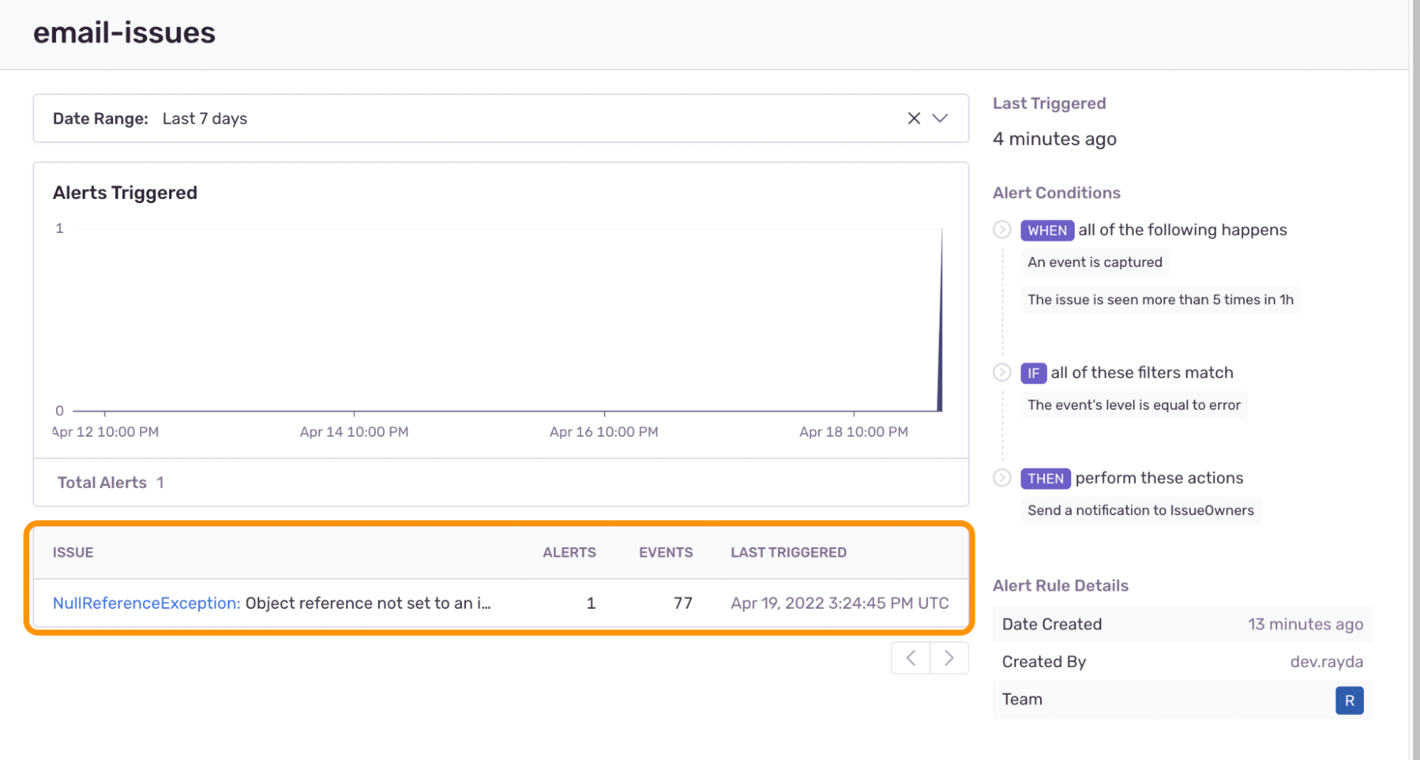 Back in Sentry, you will find 1 alert triggered, and you can check your email to find a notification sent from Sentry about this alert. The image shown below is the Alert page after getting 1 Alert triggered. You will find a graph showing the number of times this alert has been triggered over a specified date range. On the right, you will find last time this alert was triggered, the alert conditions that you specified, plus more details about this alert.