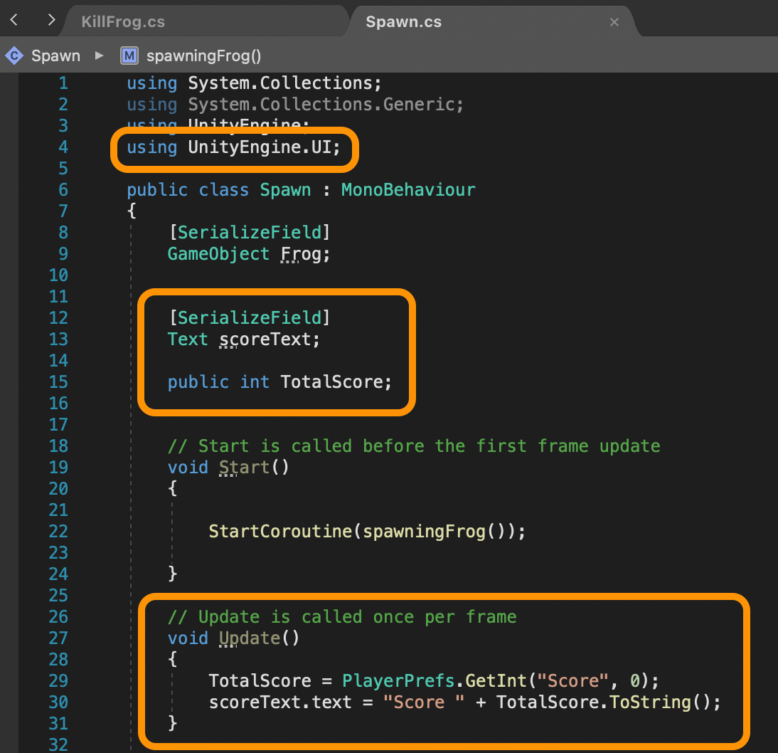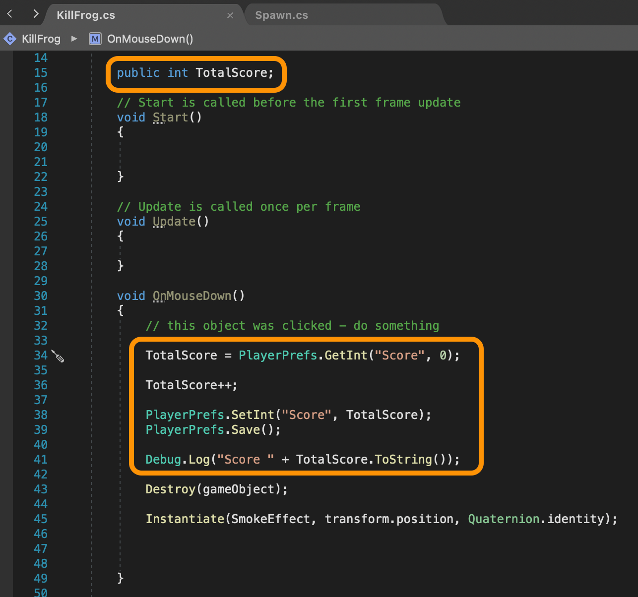 Let’s go back to the script attached to the frog, “KillFrog”, and write the code below. What we need to do is, after we kill the frog, we increase the score and save it in the player preferences variable.