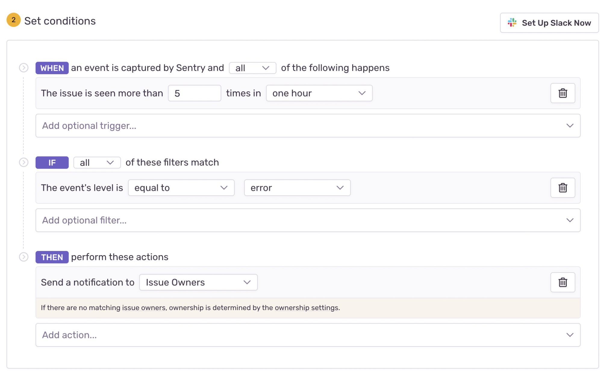 If we want to get alerted when errors occur in our Unity game, we can set up Issue Alerts in Sentry so we'll know when our code is breaking. We'd like to monitor for errors while avoid getting spammed by tons of alerts about the same errors. With Sentry you can group errors together in a single issue and get notified about the issues you care most about. You can create conditions, for example (to name a few):