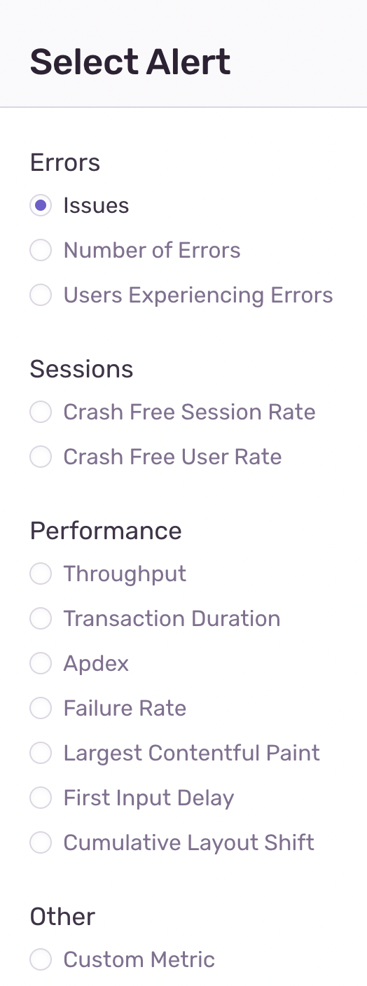 With Sentry, we can create two types of alerts: Issue Alerts for errors and Metric Alerts for performance issues as shown in the image below.