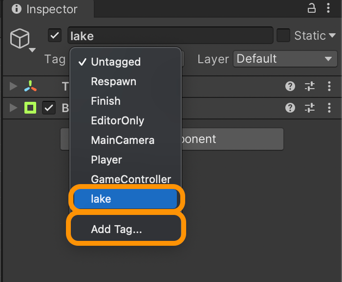 We’ll add a tag and name it “lake” in the inspector as shown in the image below.