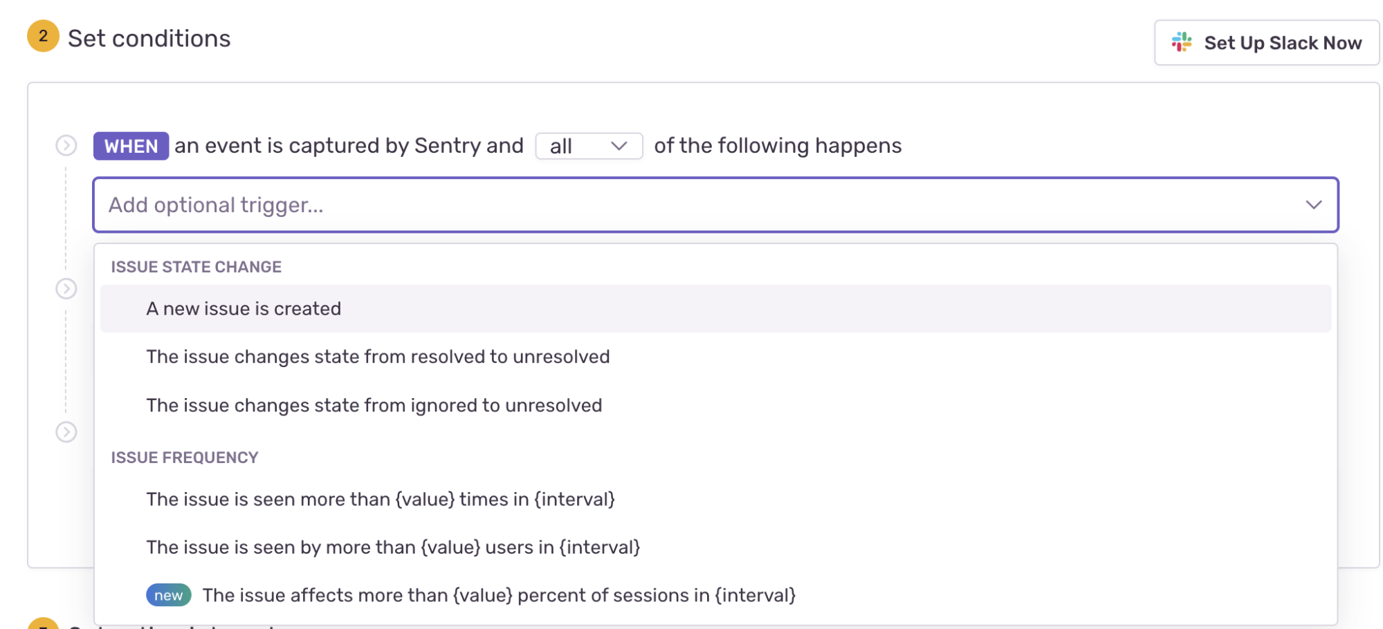 You can set rules for Issue Alerts on the alerts page in Sentry. To create an Alert rule simply click on “Create Alert” then the “Set Conditions” button.
