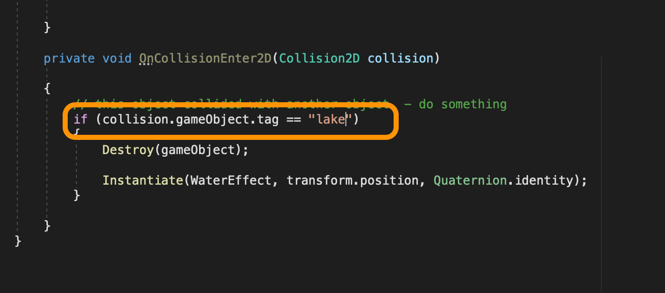 Let’s write the following code in the “KillFrog” script to make sure the frog collides only with the game object with the “lake” tag.