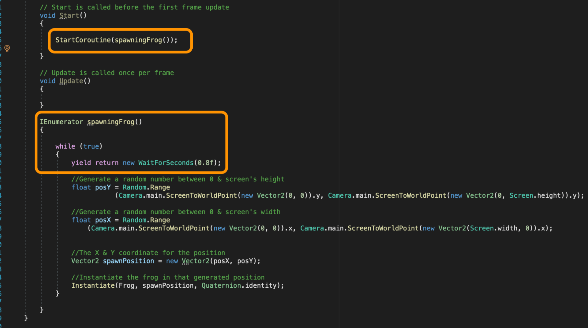 A third way to do so is to use IEnumerator function and StartCoroutine. They are used if you want to pause a running function for a few seconds and call that function again. In this code, we wait for 0.8 seconds before instantiating a frog so every 0.8 second a frog is spawned in the scene. This code runs forever, as long as the game is running. Let’s check the code below and run the game.