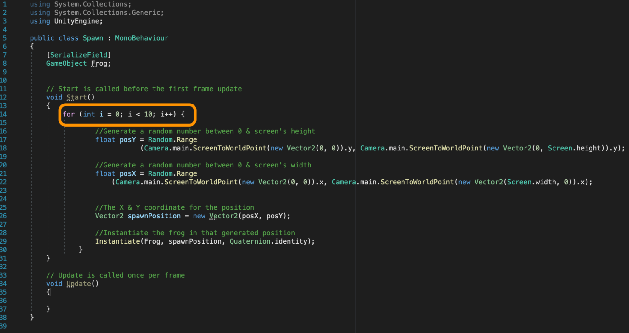 The second way to do this is to specify a certain number of frogs you want to instantiate in the current scene. We can use a for loop for this case so cut the code and paste it in the start function cause we want it to work only one time.