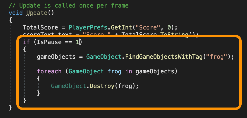 When we play the game, the frogs that were already generated are still there after we press the pause button, and the frame is active. To fix this problem, we’ll simply destroy these frogs because it is faster and easier compared to keeping the same frogs, pausing their movement, maintaining their location, and continuing falling down the screen after we press resume.