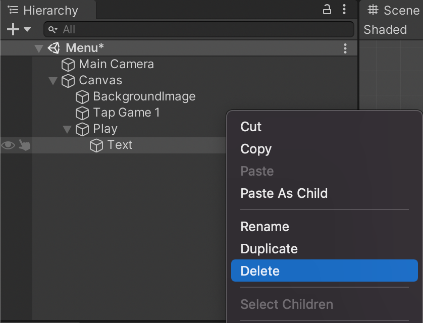 We’ll next add a play button that will take players to the game scene so they can start playing. To do so, right click in the hierarchy, add a button, and name it “Play”. You can either add an image as a sprite for the button and delete the text object as shown in the image below, or use it as it is. I will use a play button image and delete the text object.