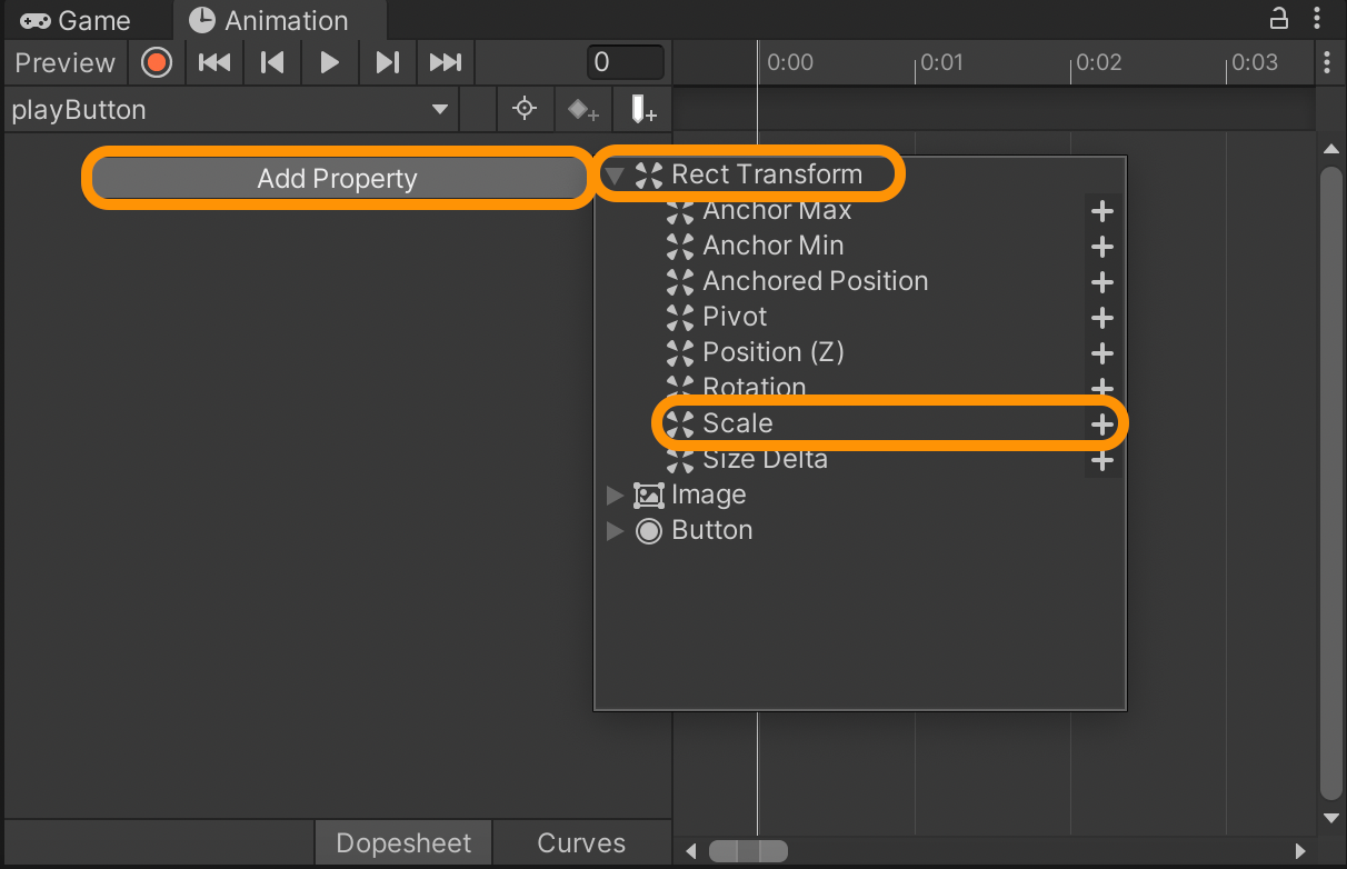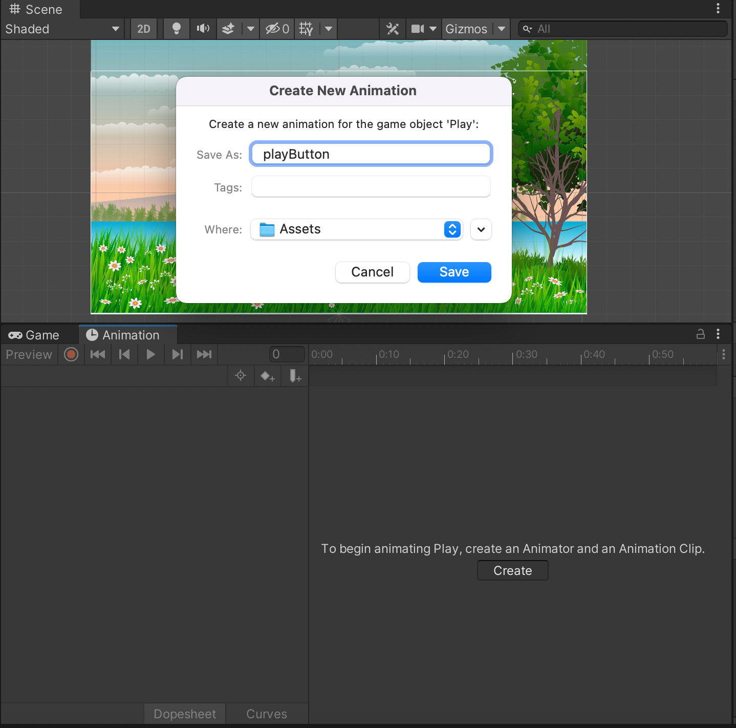 Unity has a great animation tool which we're going to use on the play button we just added. We can change a lot of properties for the button; for example, rect Transform properties, image properties, or button properties. We will scale the play button down, then scale back to its original size when it’s clicked to create the effect that we’ve pressed and released. After the animation ends, we want players to enter the game scene.