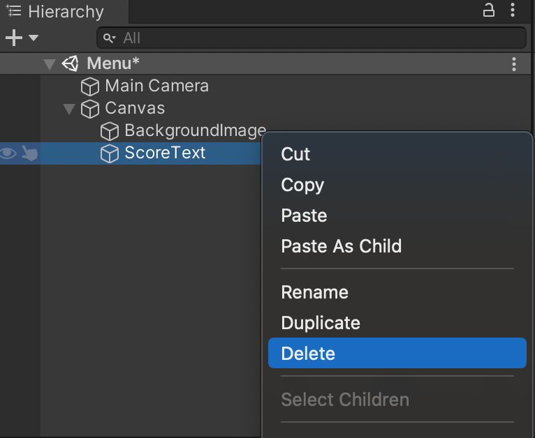 Let’s add a new scene and name it “Menu”. We will use the same background we used in the game scene. Return to the TapGame scene and copy the canvas and the EventSystem from the hierarchy, and paste it in the "Menu" scene as shown below. This will save us a lot of time. If we want, we can edit the background image later.