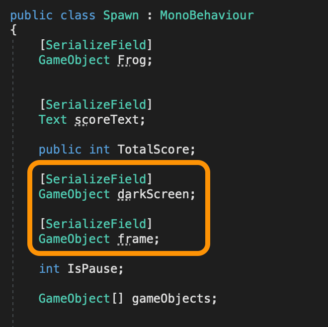 Before we try this code, make the public reference to the frame and the dark screen in the Spawn script as shown below:
