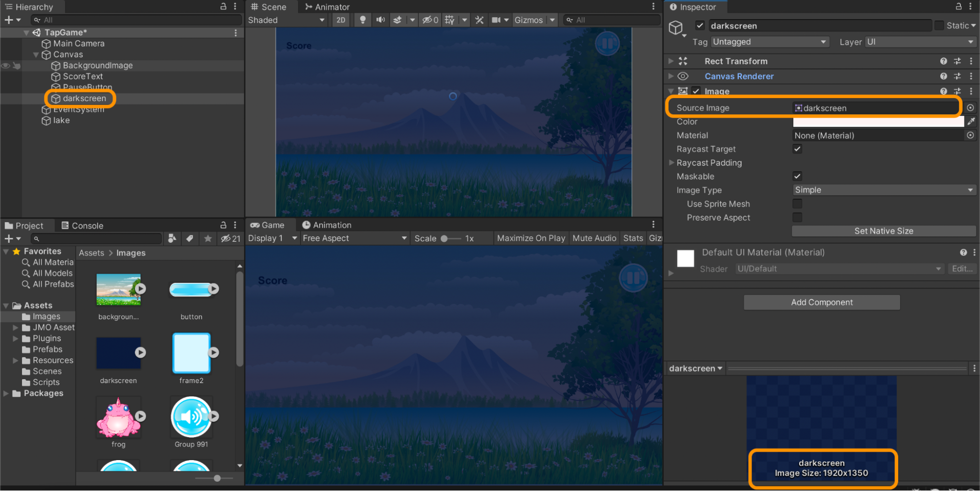 Next, we will make the UI for the pause pop-up window. We need a dark background image the same size as the background image and with an opacity of ~80% so we can still see a little bit of the background as shown below. Let’s duplicate the background image in the scene and replace the image with the dark background image.
