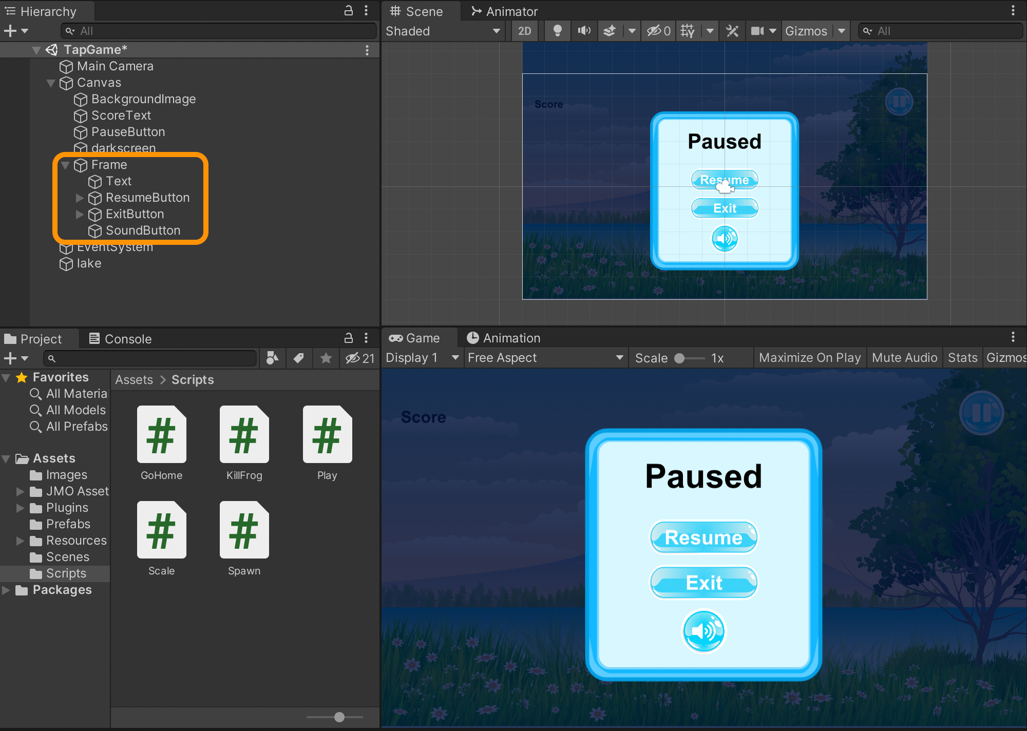 For the resume button, we need to reverse what we did for the pause button; set the dark screen and the frame to be inactive, set isPause to 0, and start the coroutine again. Write the following code in the “Spawn” script...