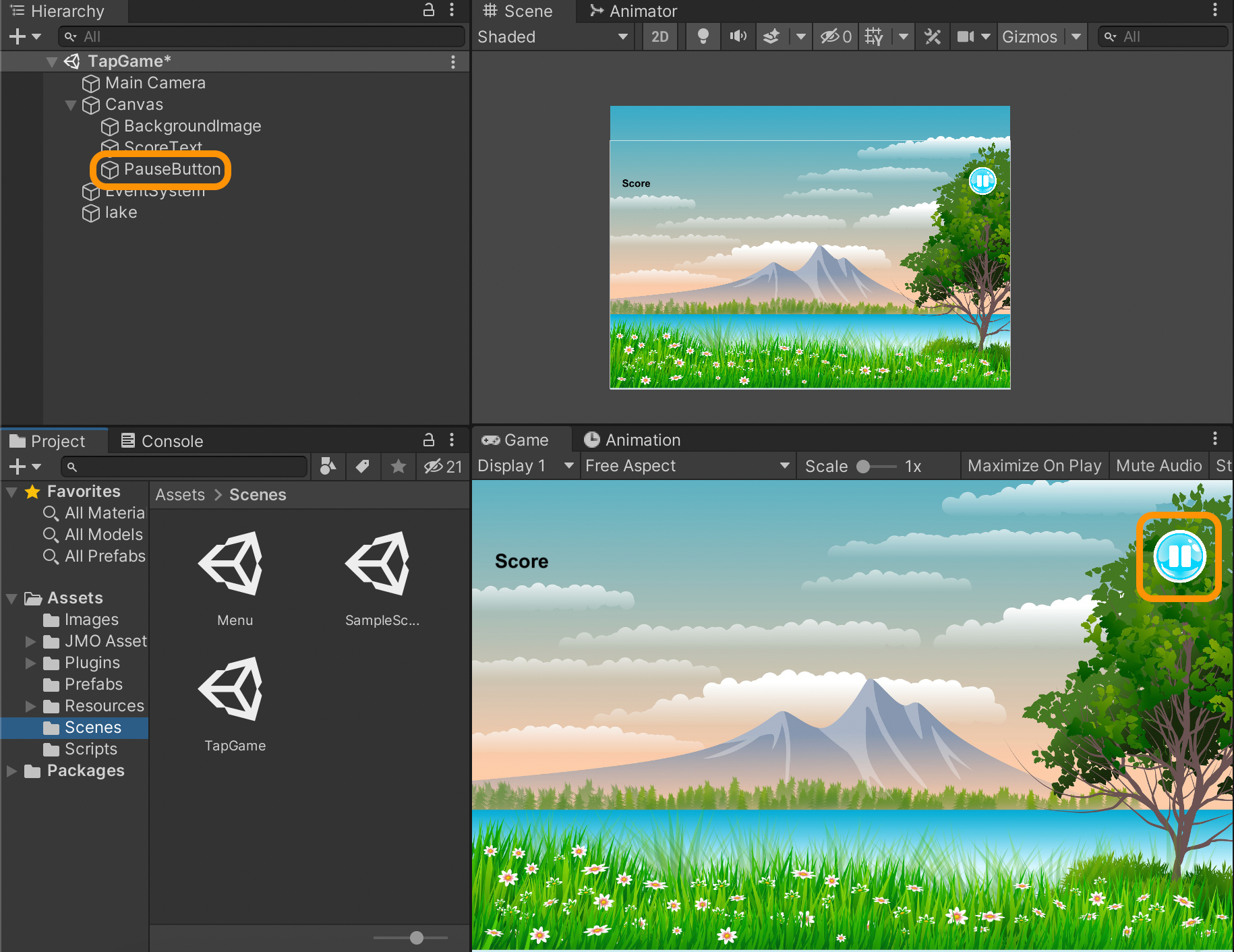 Jumping back into the game scene, we need to be able to pause the game (open a pop-up window) and then resume playing. Let’s first add the UI elements for this feature.