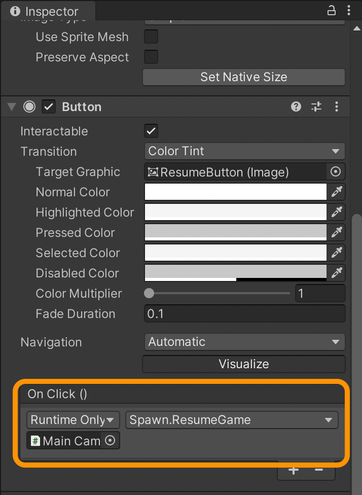 }...and add this function to OnClick() of the resume button. It should look like this: