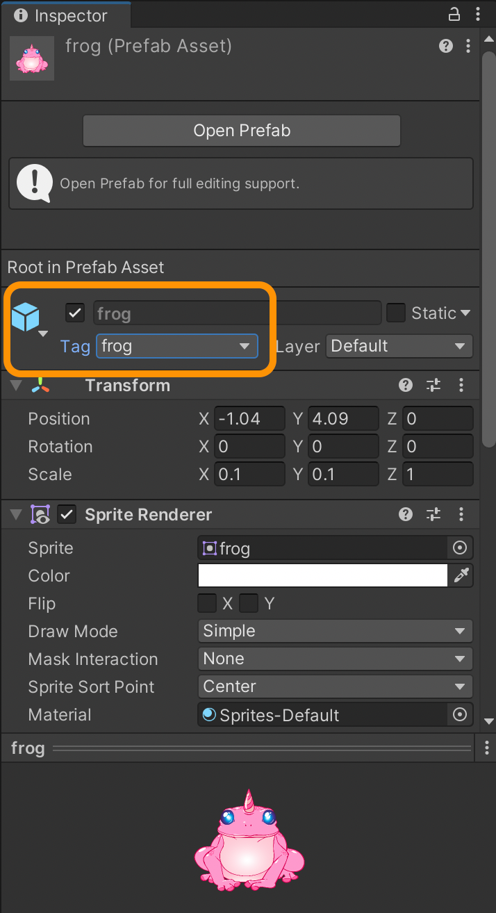 Let’s add a tag, “frog”, then destroy game objects with the tag “frog”.