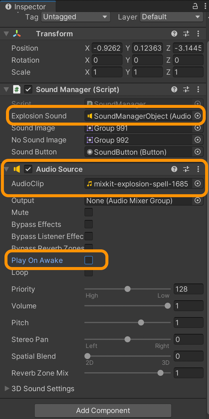 The only thing missing is an explosion sound when the frog explodes. To do so, we need to add the audio source component to the “SoundManagerObject” game object. Select it, add the “Audio source” component, and drag the sound file into the empty field as shown below.