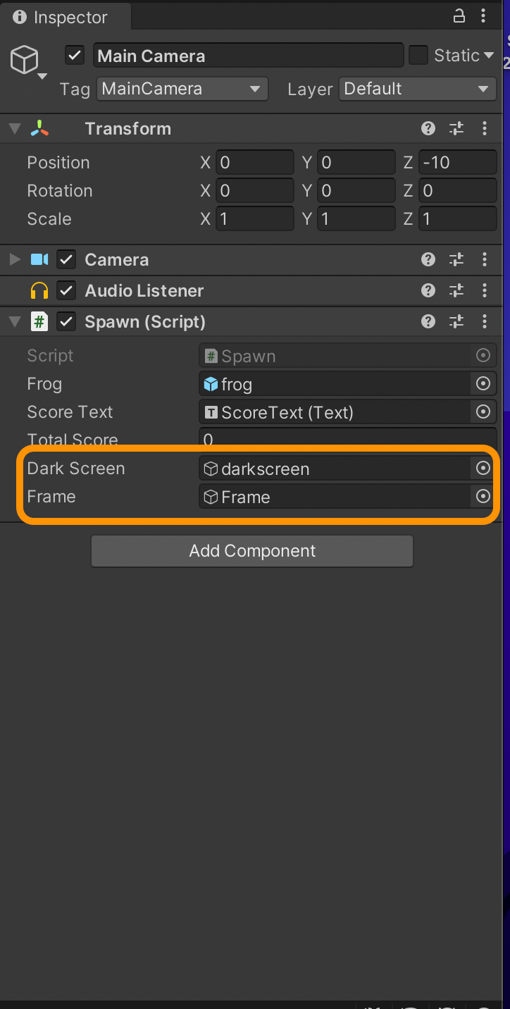 Then drag the dark screen object and the frame objects from the scene into the empty fields in the inspector for the Spawn script as shown below: