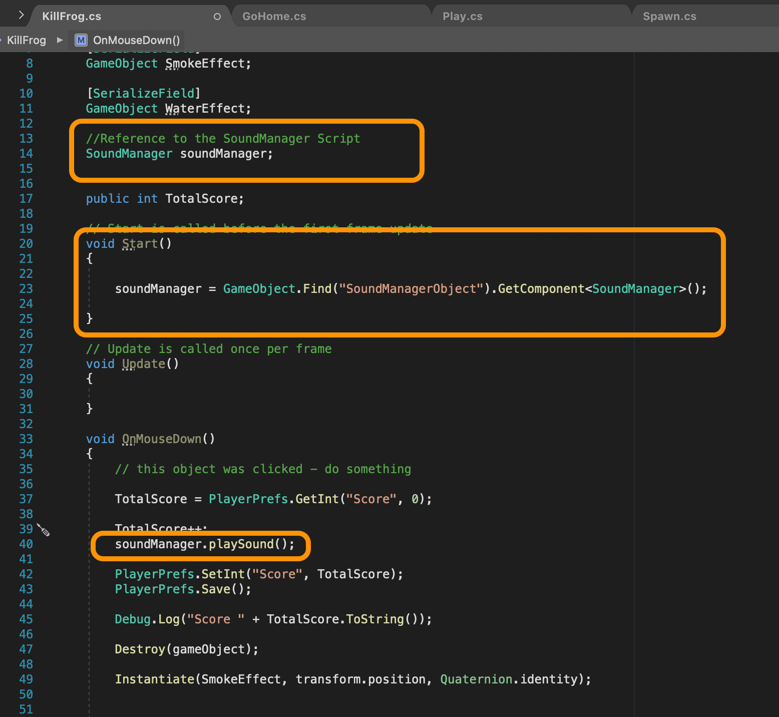 Lastly, edit to the “KillFrog” script to play the sound when we click/destroy the frog. We will add the following code inside this script:
