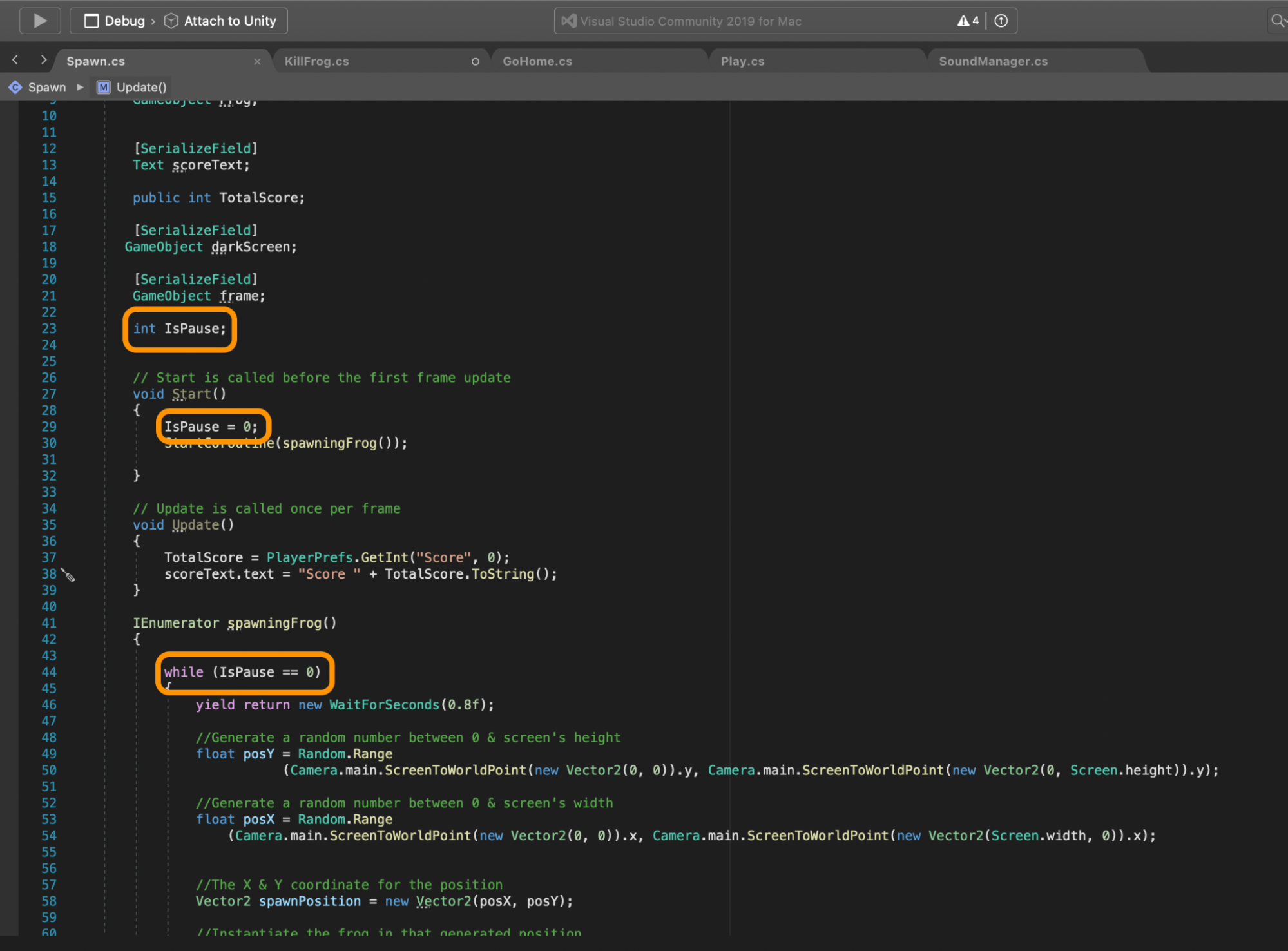 Next, we need to write a “pause the game” function within the “Spawn” script: