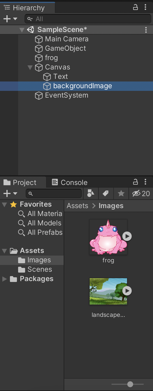 Let’s give our game (and frog) a background image. We can import a background image into the assets/images folder. I added the image GameObject into the scene and named it “BackgroundImage”.