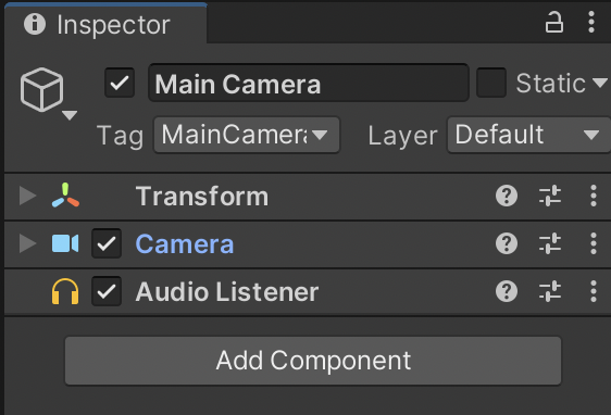 From this window, you can change any component of the selected GameObject. In the image shown below, the Main Camera GameObject is selected, and below is all the detailed information for the Main Camera. “Transform”, “Camera”, and “Audio Listener” are all components added to the Main Camera by default. You can add more components to a GameObject by using the “AddComponent” button. We will talk more about components later.
