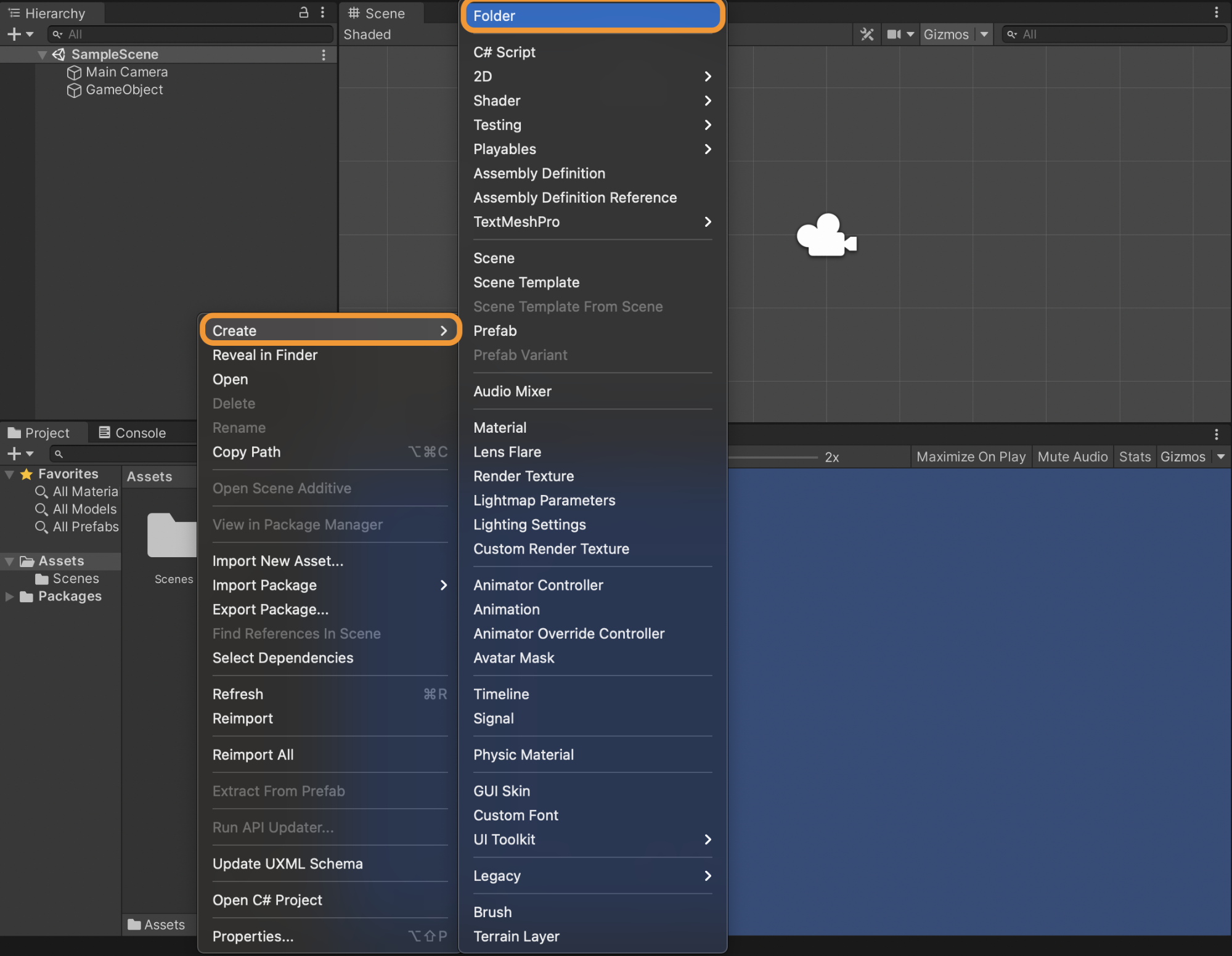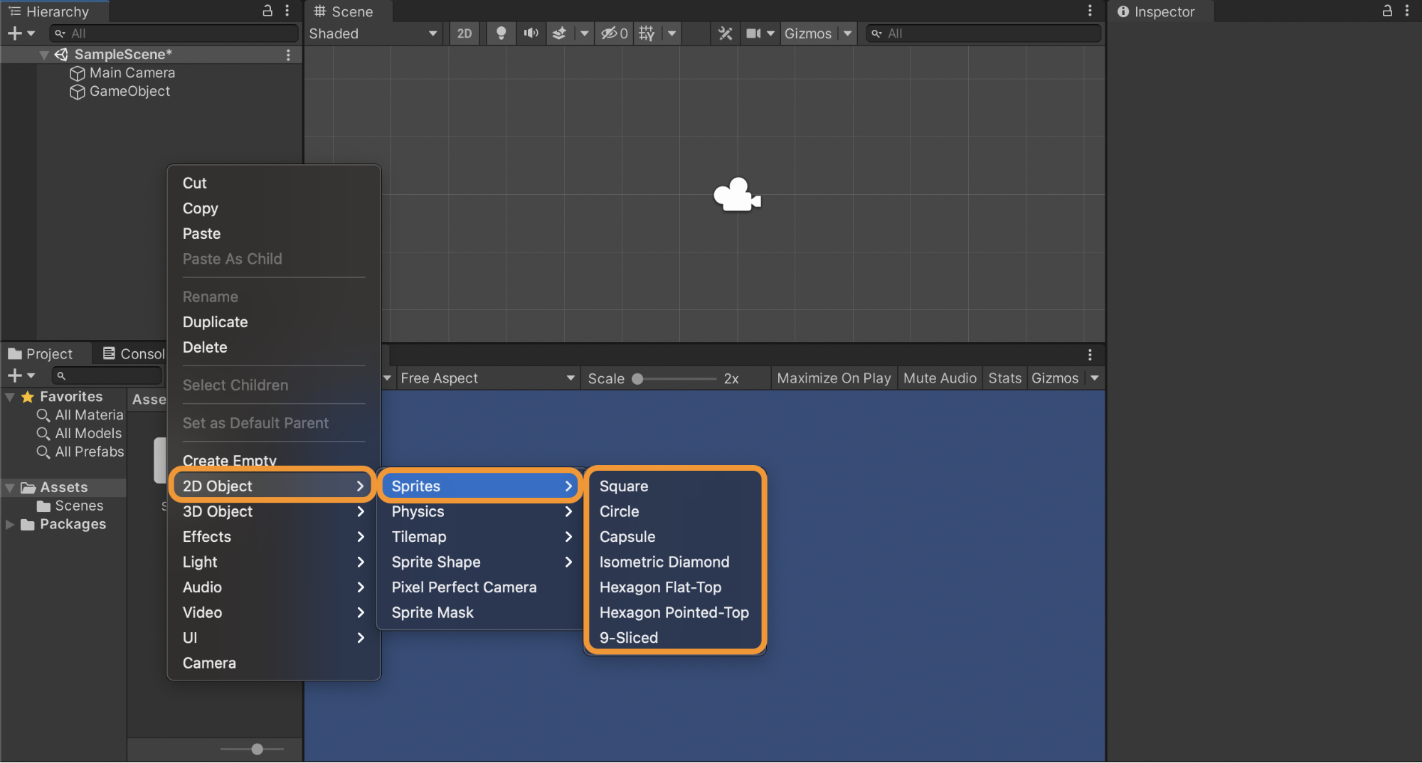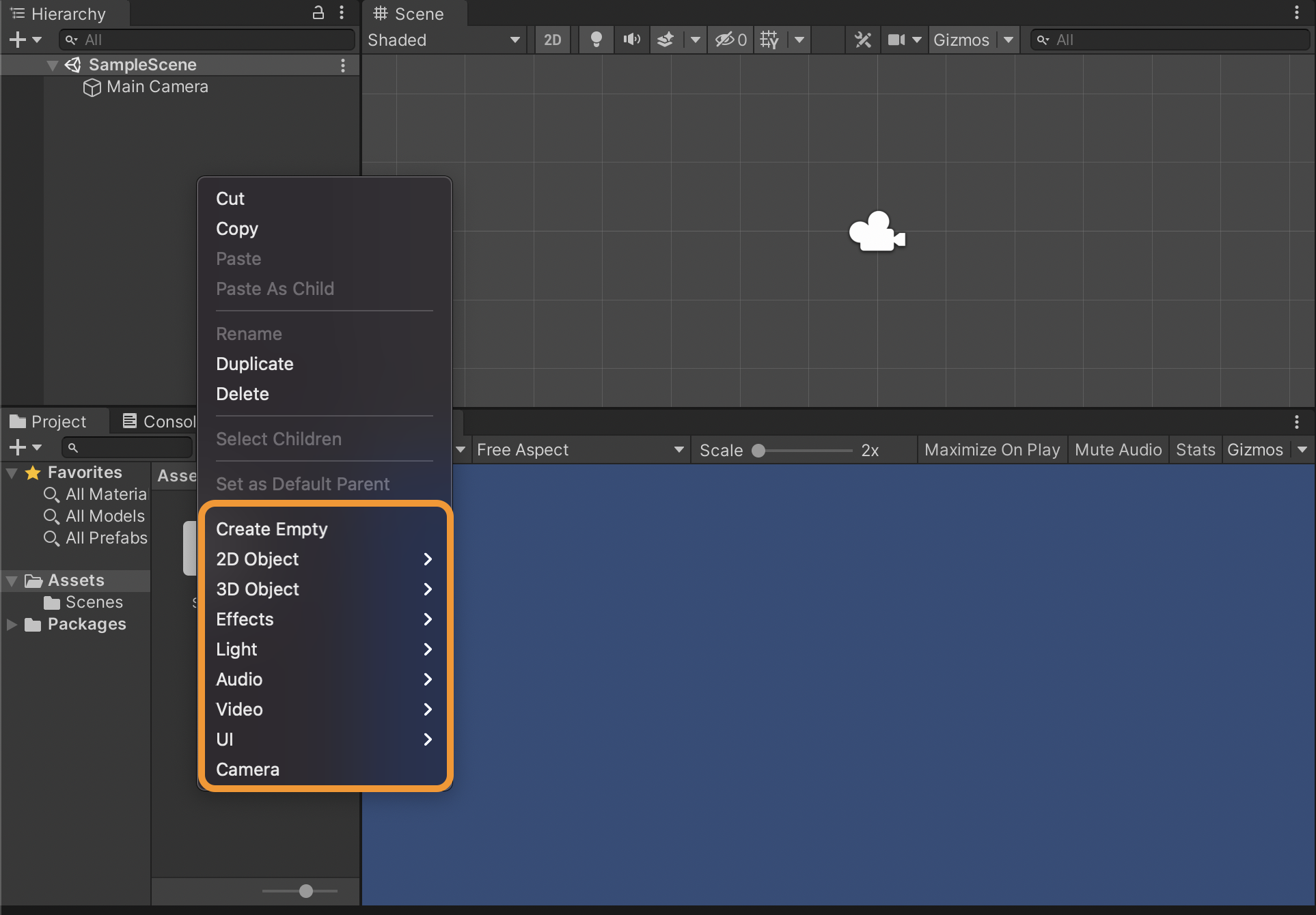 Right-click in the Hierarchy window, then choose any of the objects from the popup menu as shown in the image below. You can create an empty object, select a 2D object, a 3D object, effects, and so on.