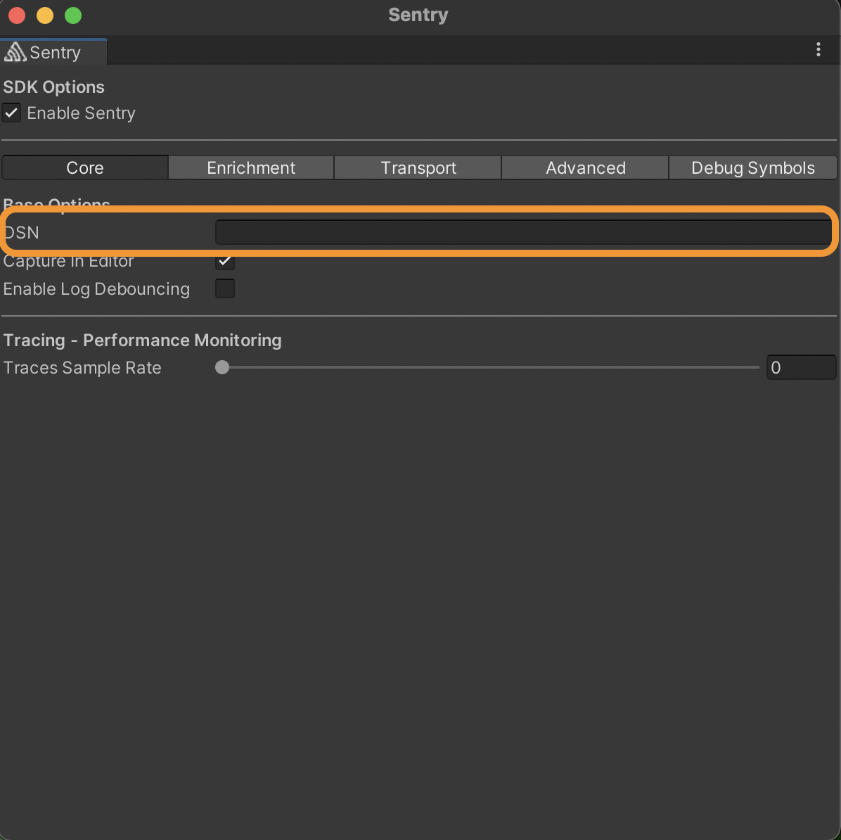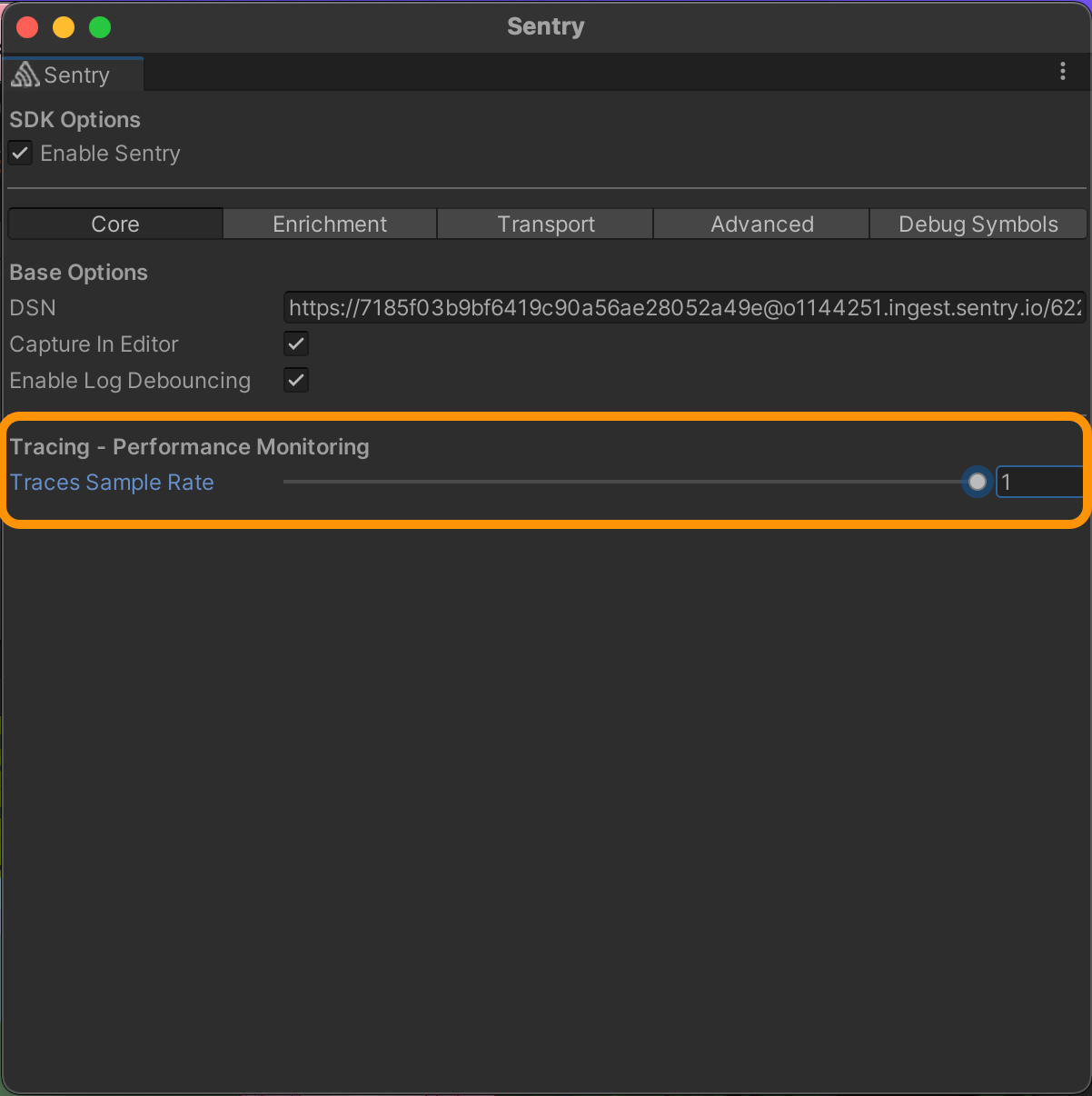 Back in the Unity editor, navigate to Tools > Sentry > then change the "Traces Sample Rate" to a value between 0 and 1, as shown in the image below. Inputting "1" will send 100% of transactions to Sentry.