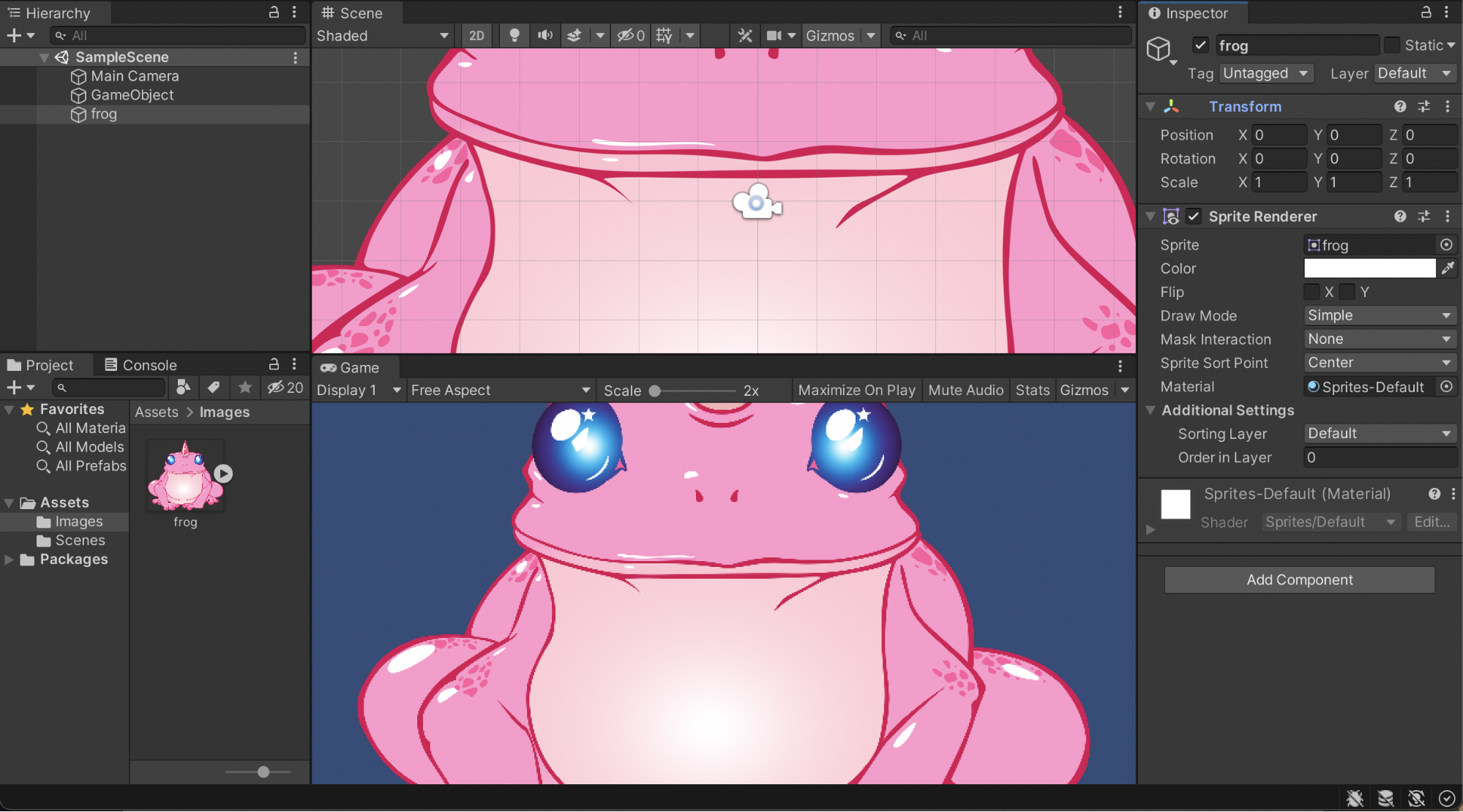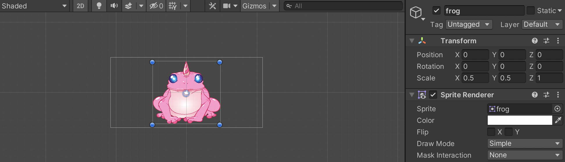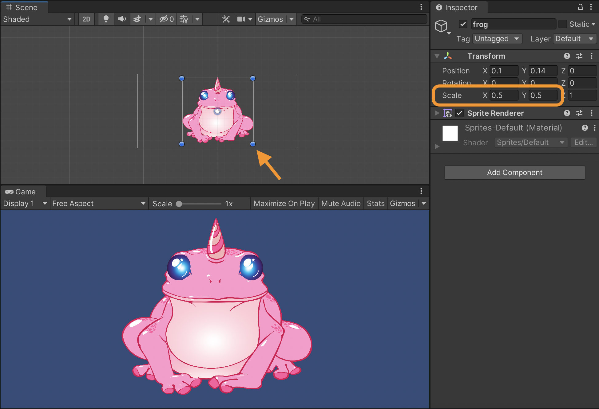 We need to scale the frog down as it is too big. To do so, select the frog, then go to the Inspector and change the Scale in the Transform Component to a smaller size (0.5, for example). Another way to do this is to select (and grab) the image by one of the blue dots around it's edges and, while holding the shift key to maintain aspect ratio, drag it to the size you want.