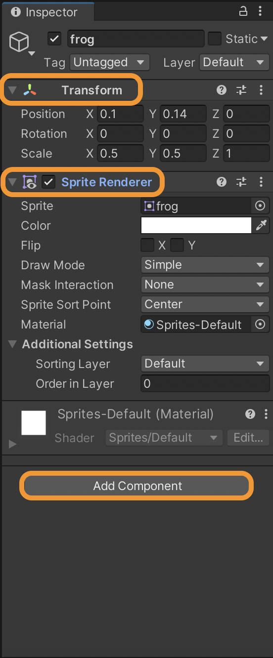 The Transform component has the object’s position, rotation, & scale in X, Y, & Z coordinates. Since this is a 2D game object, Z will be 0. These are pretty self explanatory.