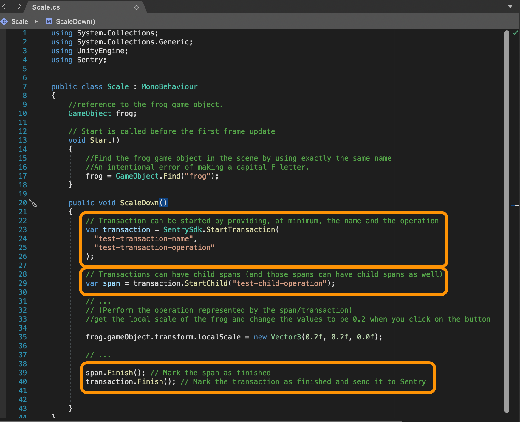 We can open our "Scale" C# script to capture transactions for Sentry to monitor our project’s performance. We set this up by adding the code below: