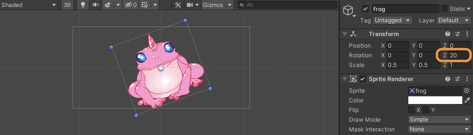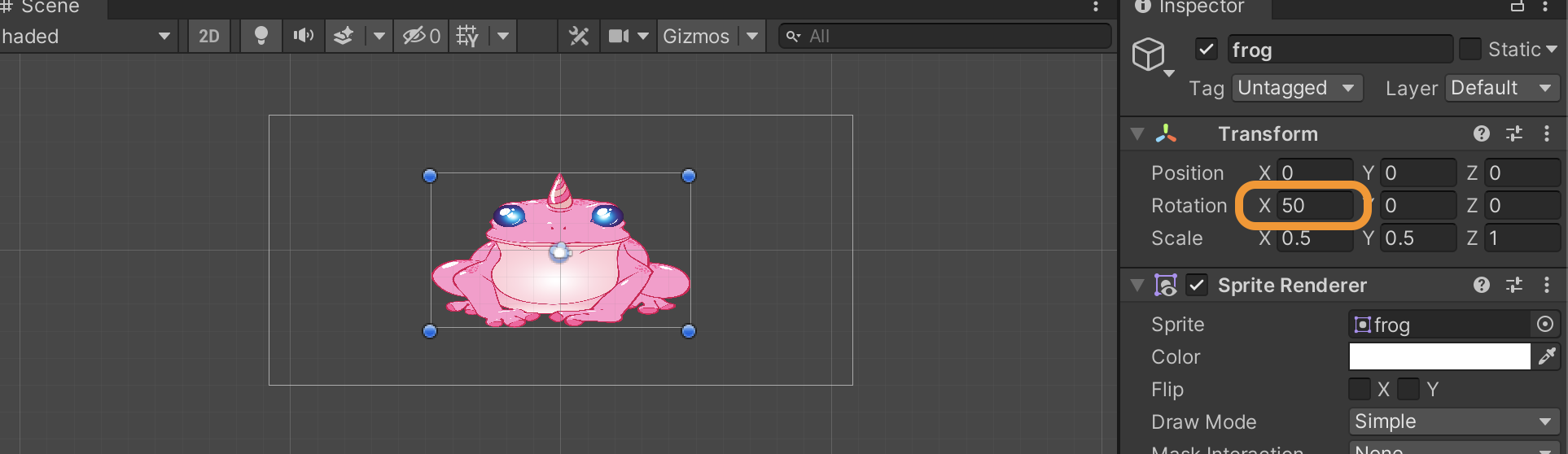 The Sprite’s rotation will rotate around the pivot. Let’s change rotation values and check the frog. If we change the X value, it will rotate around the X axis.