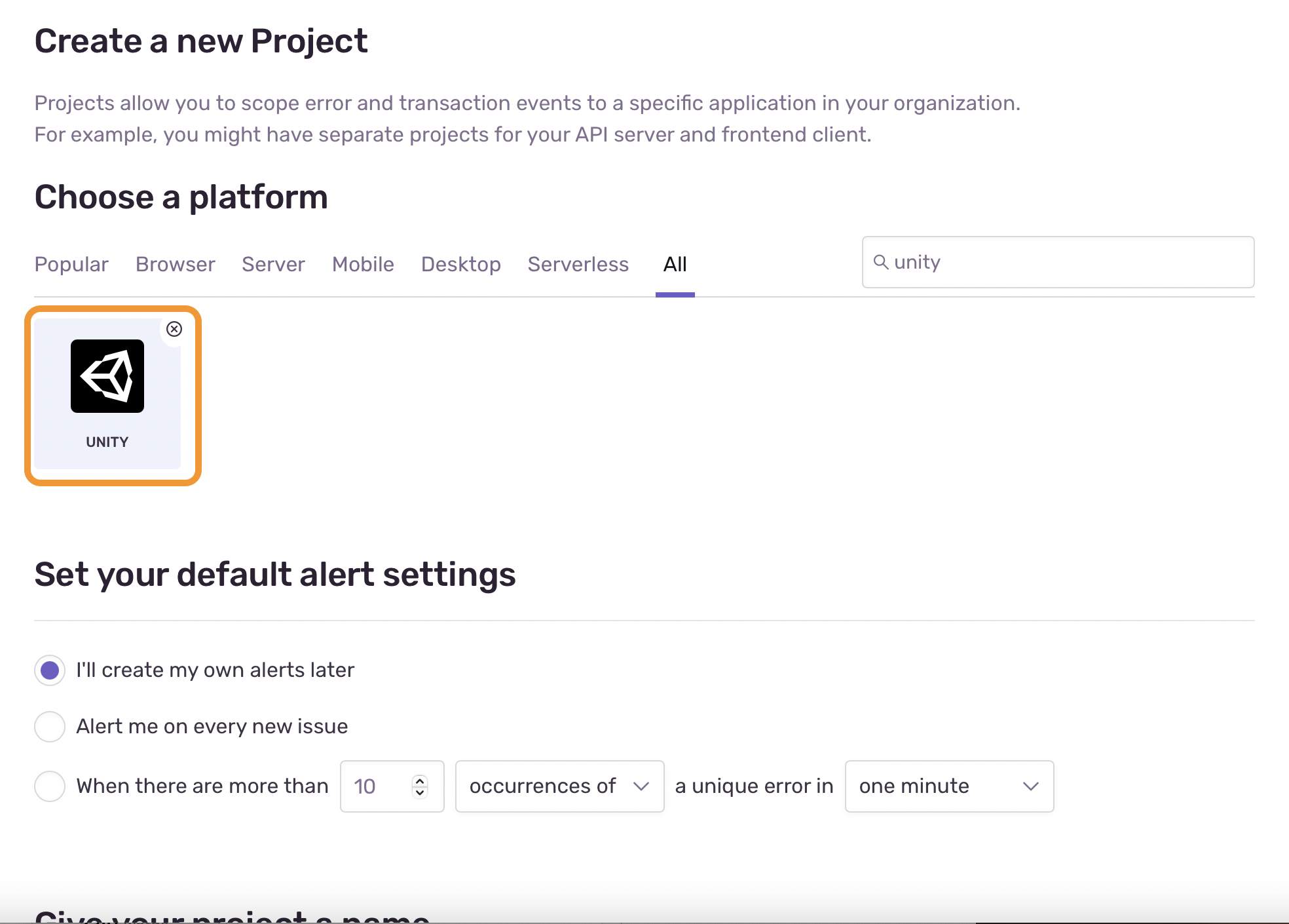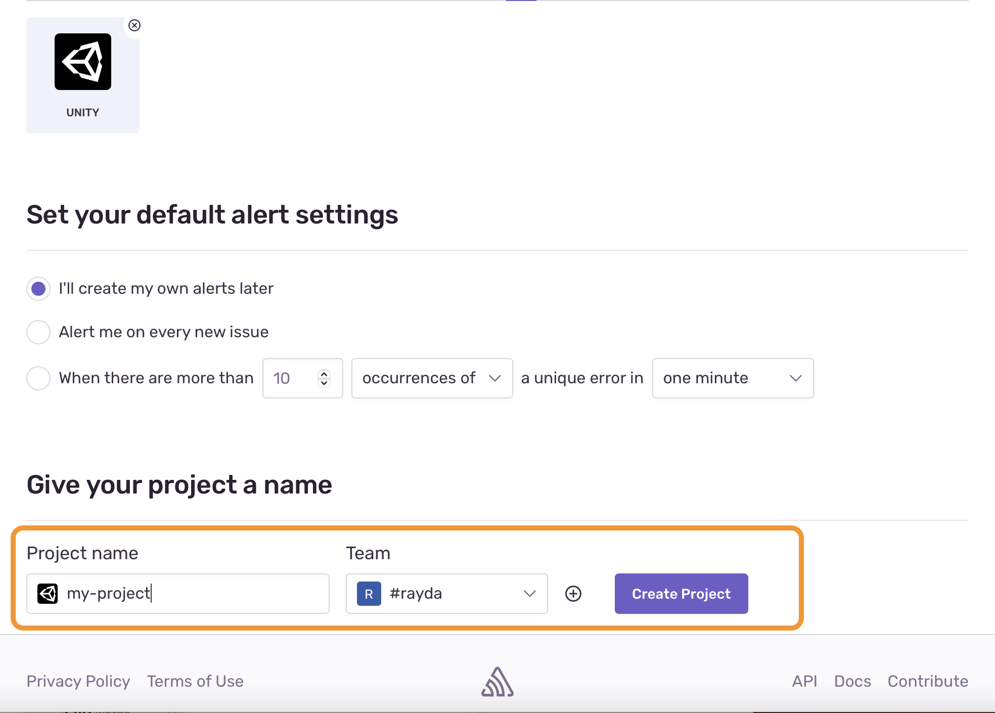 Create a new project in Sentry and give it a name. You can associate projects with certain teams, which is useful for large organizations.
