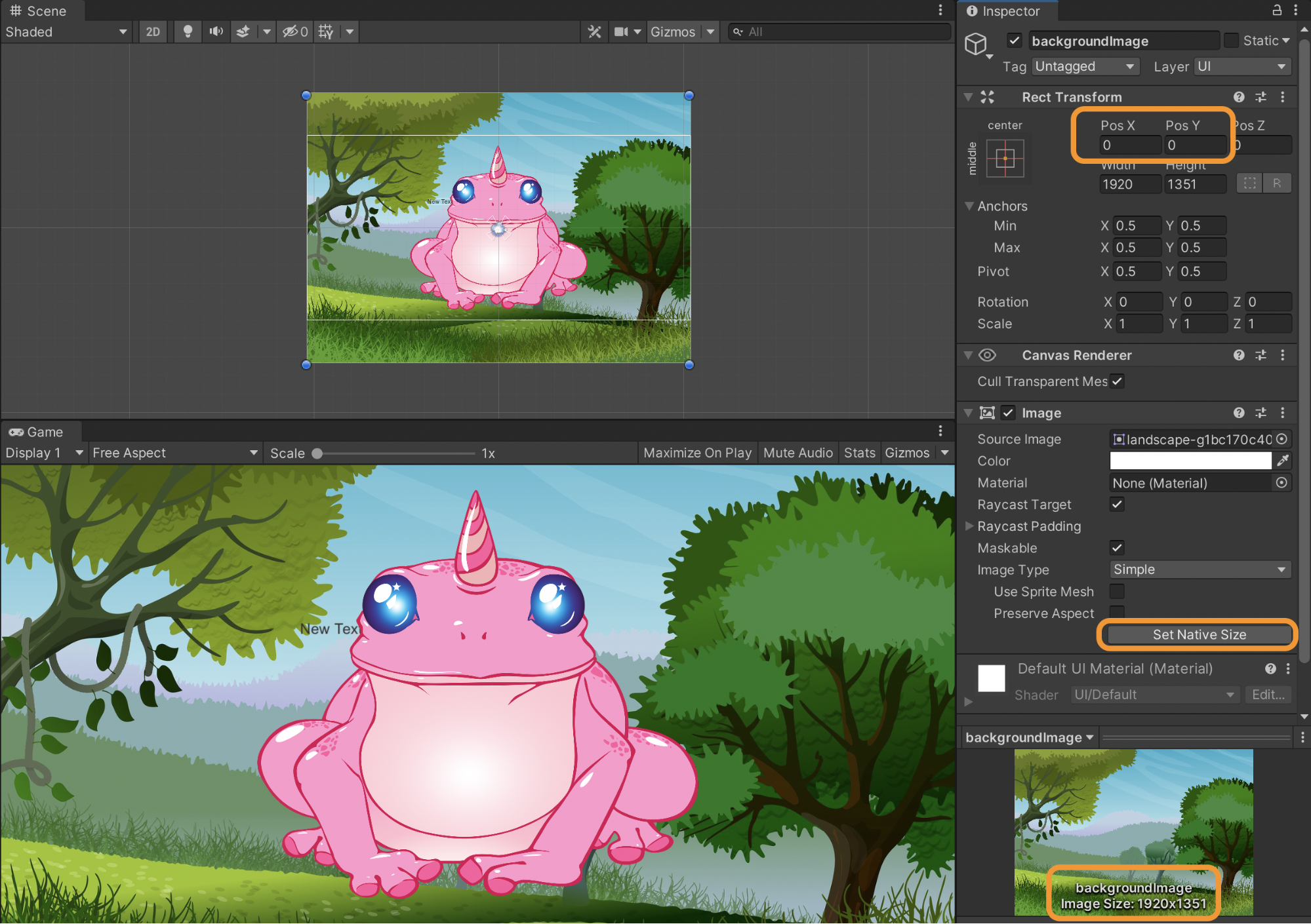 If the image looks too small, navigate to the image component and click “Set Native” to make the image its original size. But now it's too big. Make sure position X & Y are both set to zero so that the image is centered.