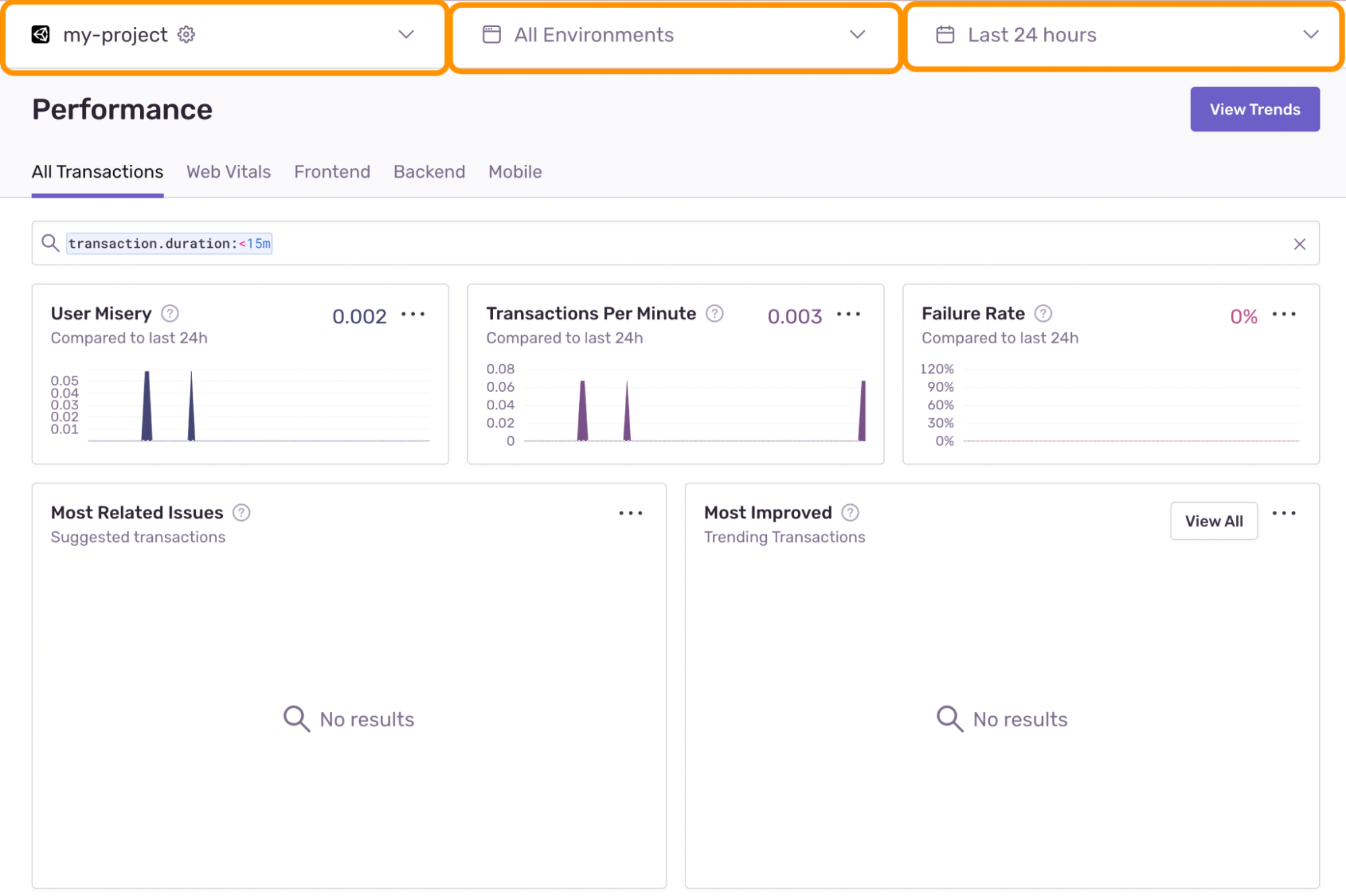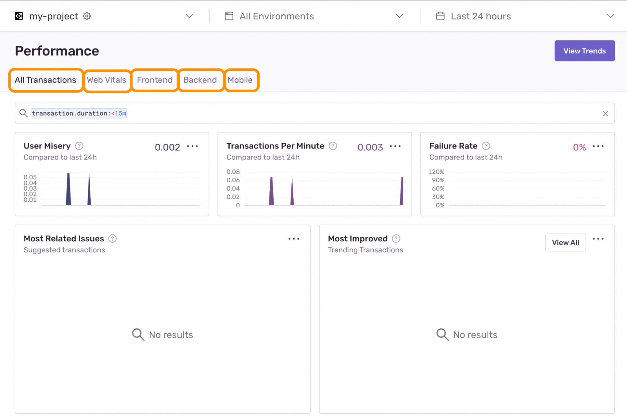 We can look at all transactions, or filter to only look at web vitals, frontend, backend, and/or mobile transactions.