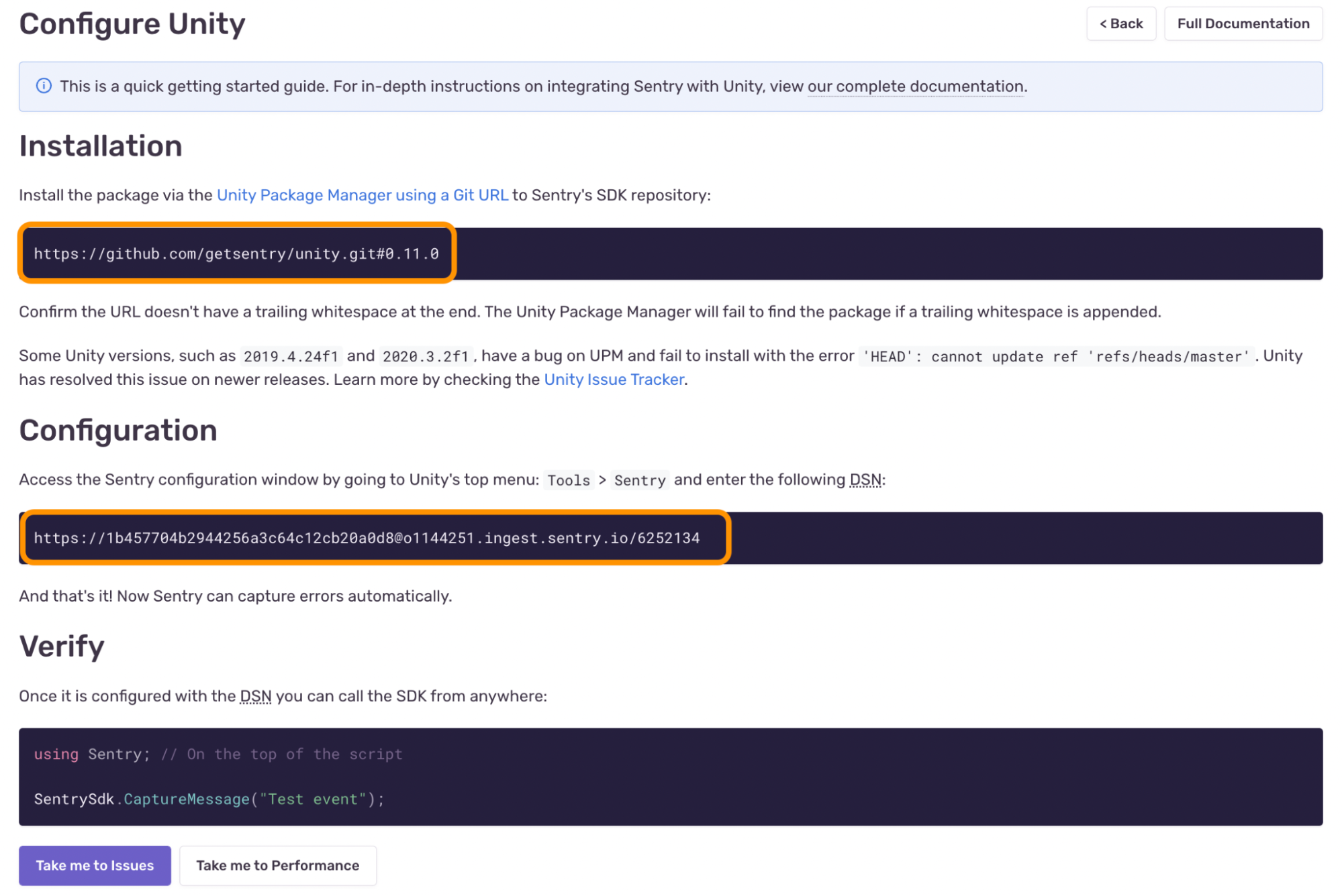 Once your project is created, you will find the steps to install the package, configure your DSN, and call the Unity SDK.