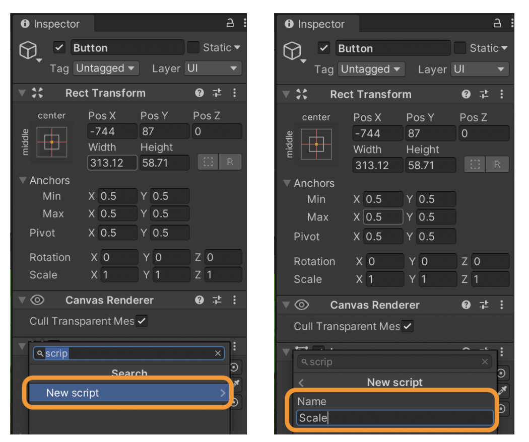 Let’s add a small C# script to our button GameObject so that when we click the button, the frog scales down. We'll add a script component to the button by clicking on “Add Component” in the button’s inspector and name the script “Scale”.