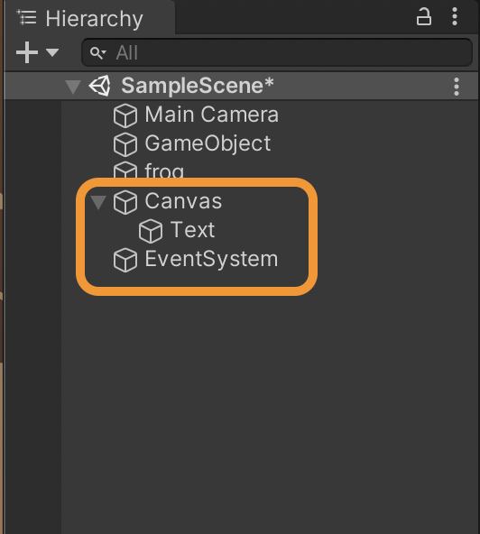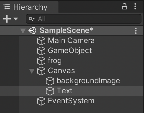 When you add a text, image or button GameObject, a Canvas and an EventSystem are automatically added to the Hierarchy. Let's define and understand these, and then we'll continue on with the GameObjects.