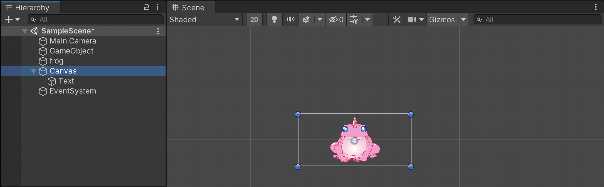 When we look at our frog in the game view and scene view, you'll notice the text is very small in the game view and the Canvas is shifted in the scene view.
